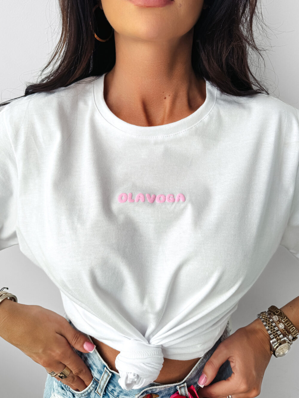 Klasyczny t-shirt damskie FLOSSY OLA VOGA, to oversizowy model z krótkim rękawem o klasycznym fasonie. Wykonany z wysokogatunkowej, ekologicznej bawełny. Na przodzie niewielkie logo OLA VOGA w kolorze różowym podobnie na tyle – duża aplikacja OLV since 2015. To świetny element Twojej garderoby!