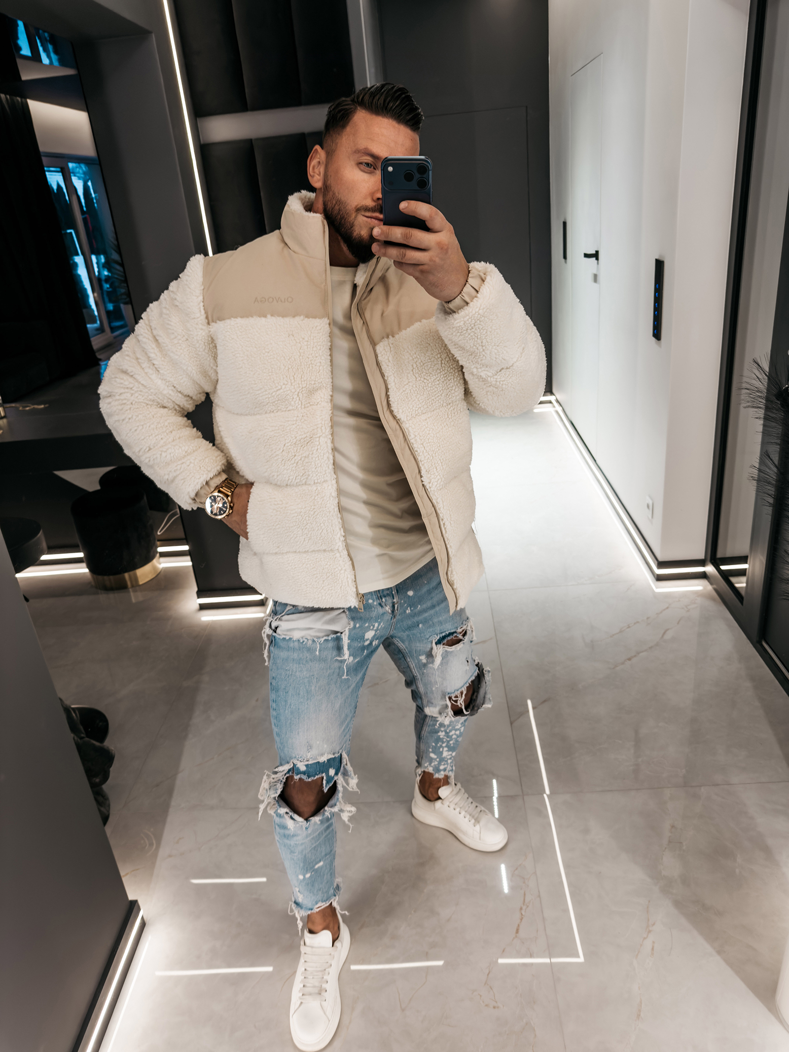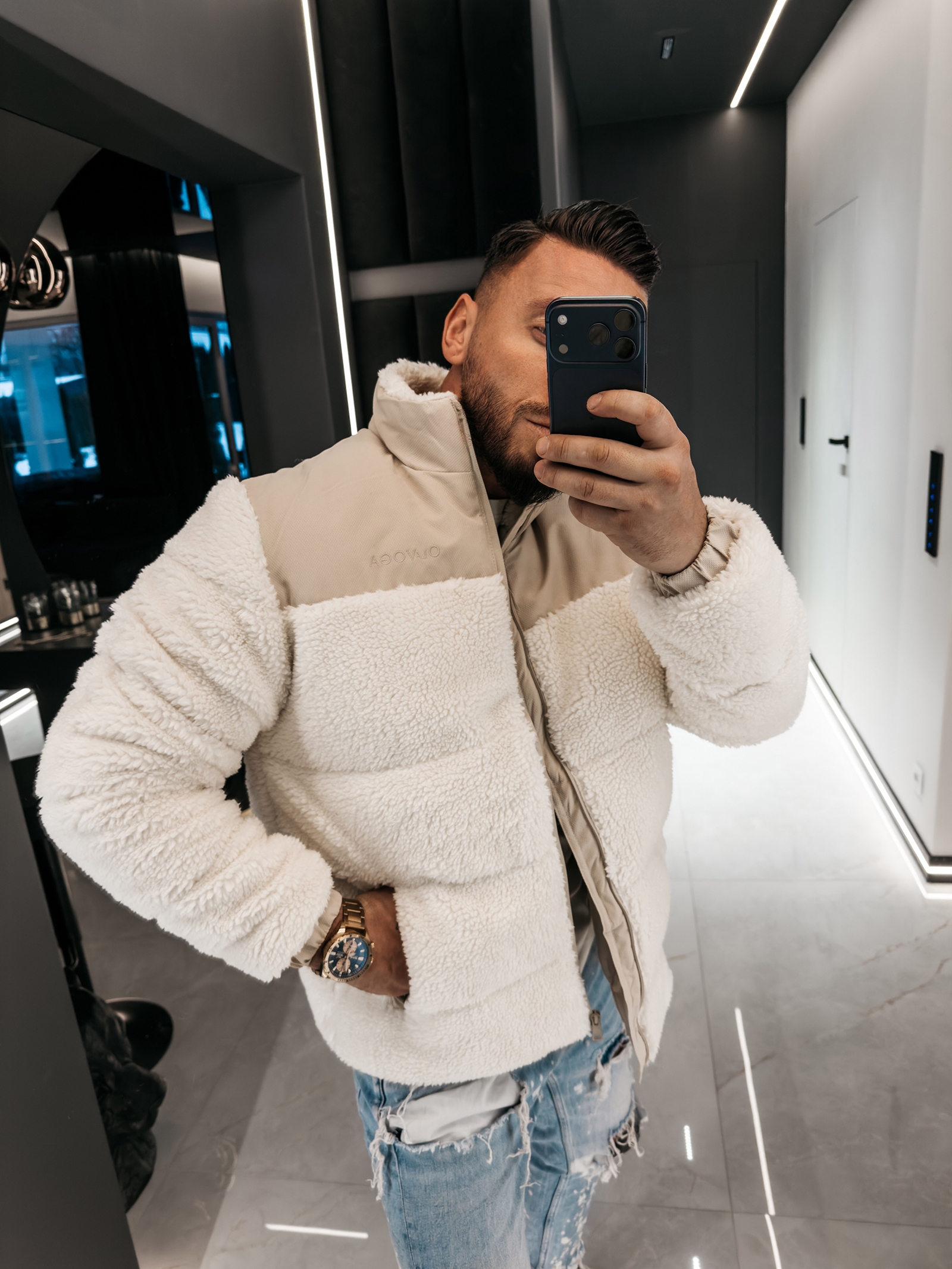 Neutralny kolor rozjaśnia sylwetkę, nadając jej lekkości. Subtelne logo olavoga, umieszczone na piersi, dodaje całości luksusowego charakteru. Tym samym model ten wyróżnia się subtelną elegancją i dopasowuje do niemal każdego stylu – od casualowego po smart street.