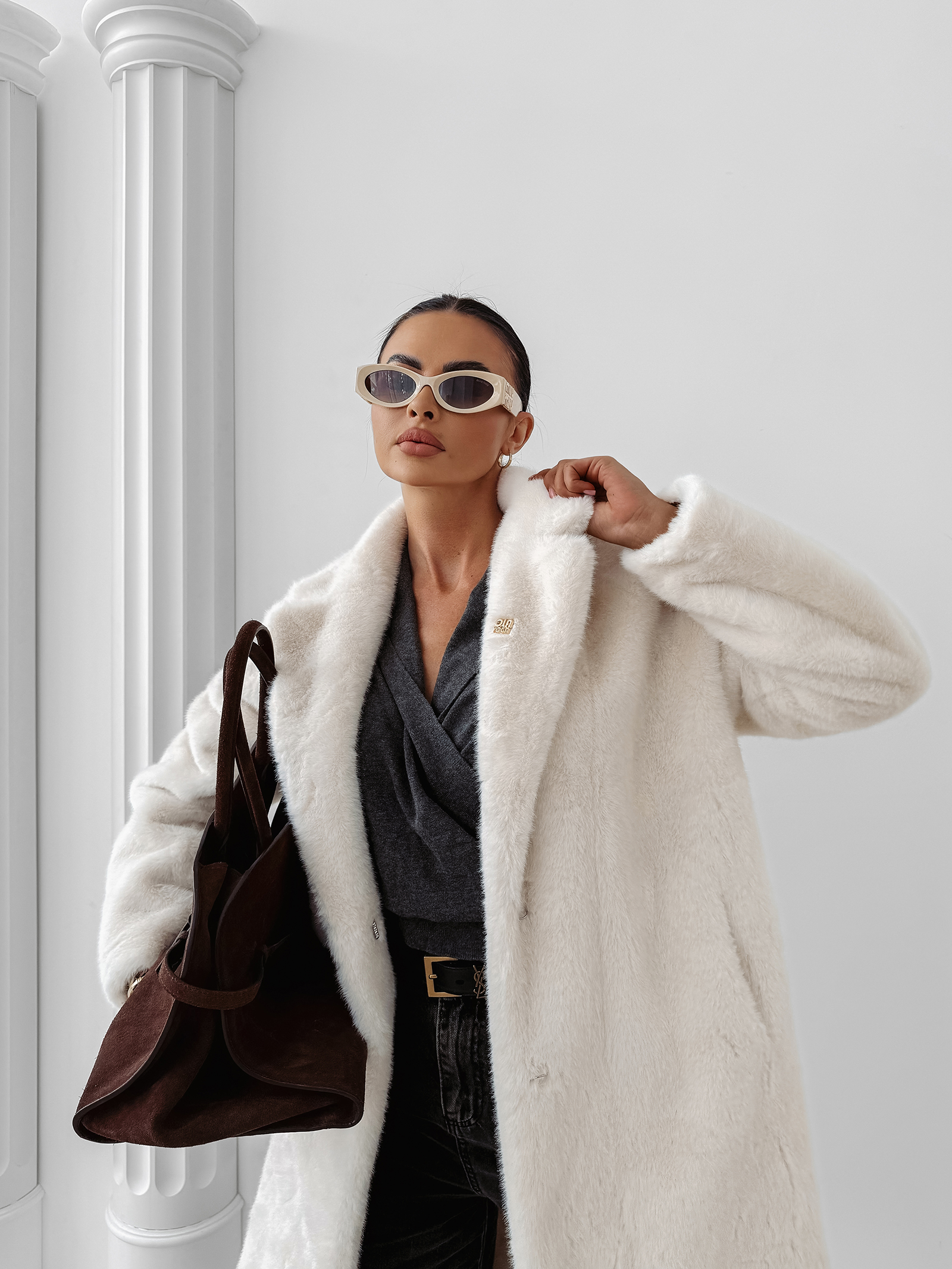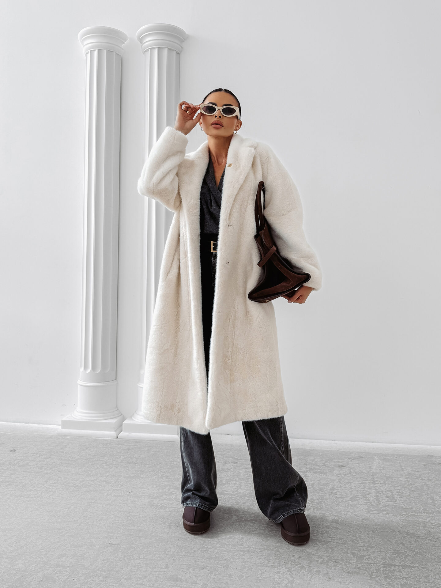 OLAVOGA MINO – płaszcz damski ecru w eleganckiej, nowoczesnej formie