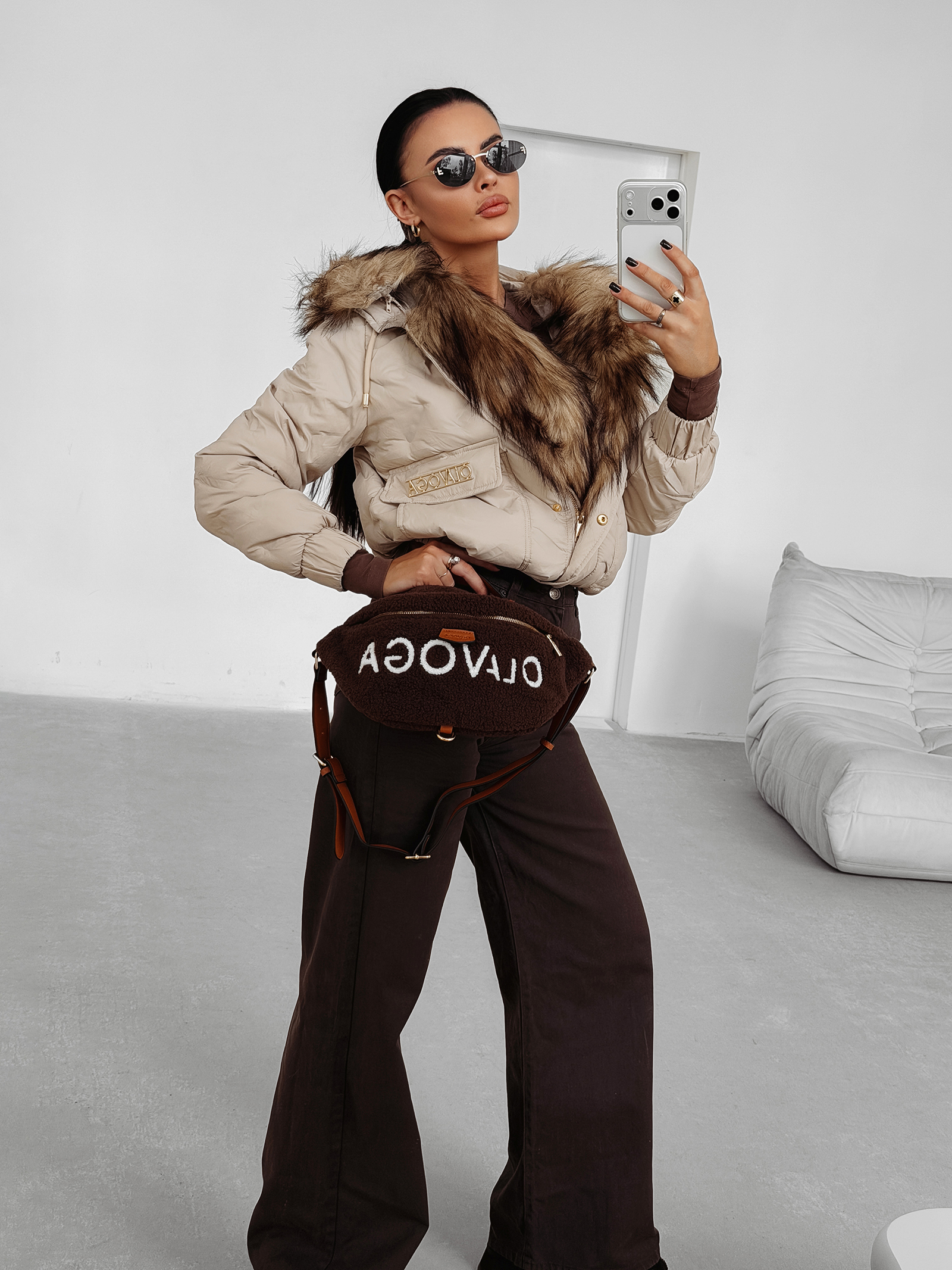 Wnętrze kurtki oraz kaptur zostały wykończone miękkim, efektownym futerkiem, które można w całości odpiąć. Dzięki temu model RAURE jest niezwykle praktyczny – idealny zarówno na zimowe spacery, jak i chłodniejsze, miejskie wieczory. Subtelne detale, takie jak złoty, logowany element OLAVOGA na kieszeniach czy inicjały marki z tyłu, podkreślają jej ekskluzywny charakter i precyzję wykonania.