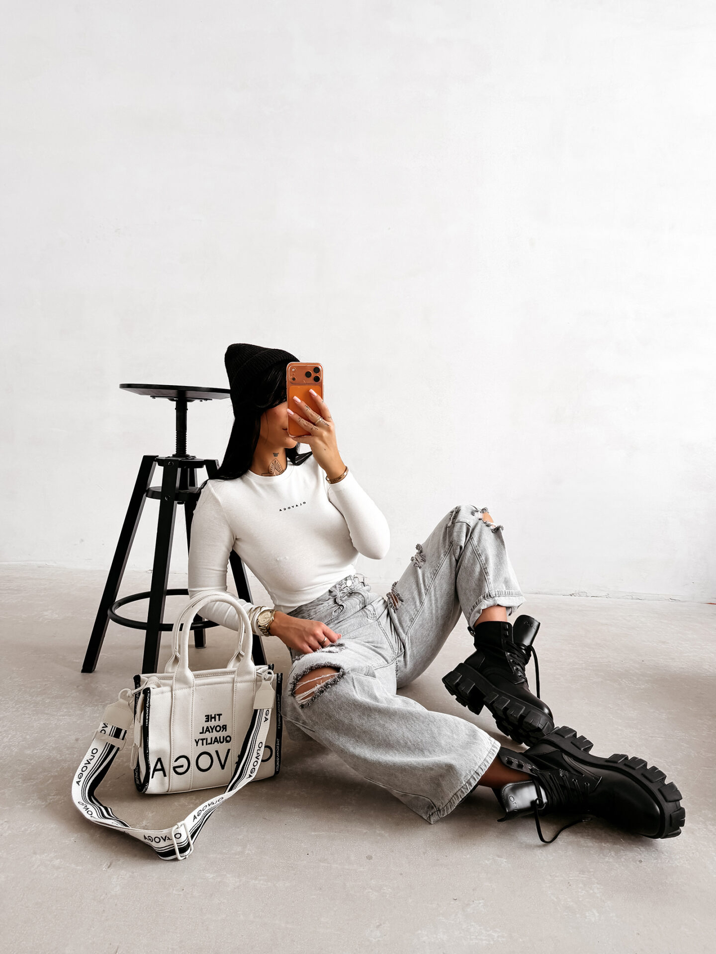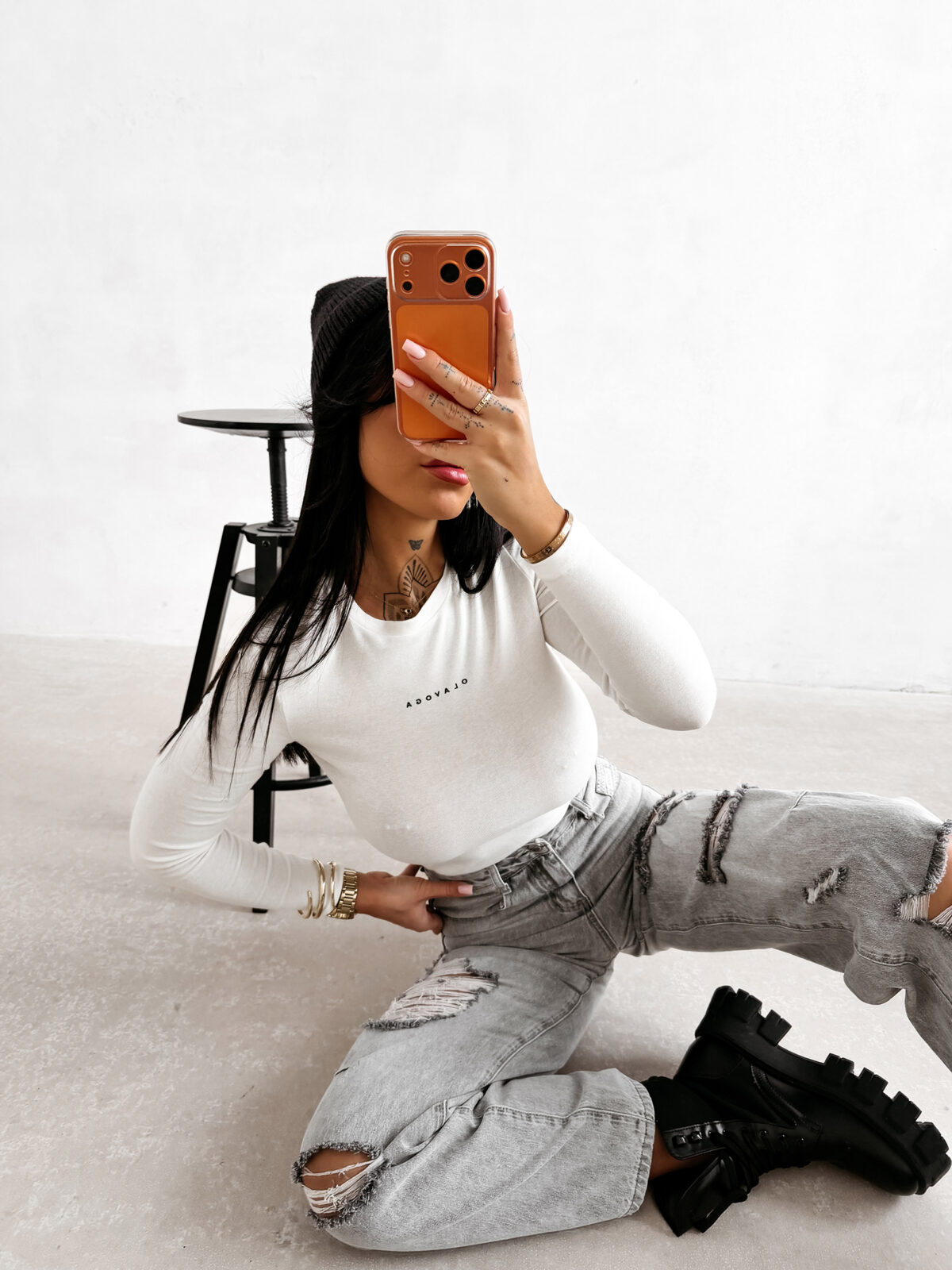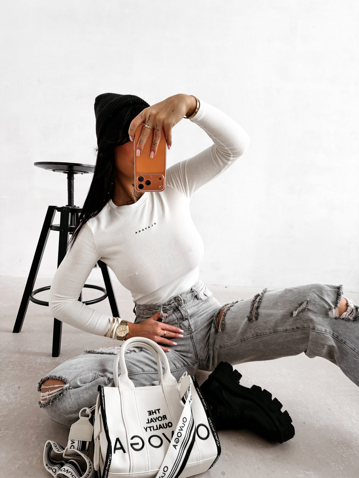 Bluzkę zdobi subtelne logo OLAVOGA umieszczone na przodzie. Element ten wprowadza do projektu elegancję, jednocześnie pozostając zgodnym z charakterem minimalistycznych stylizacji.