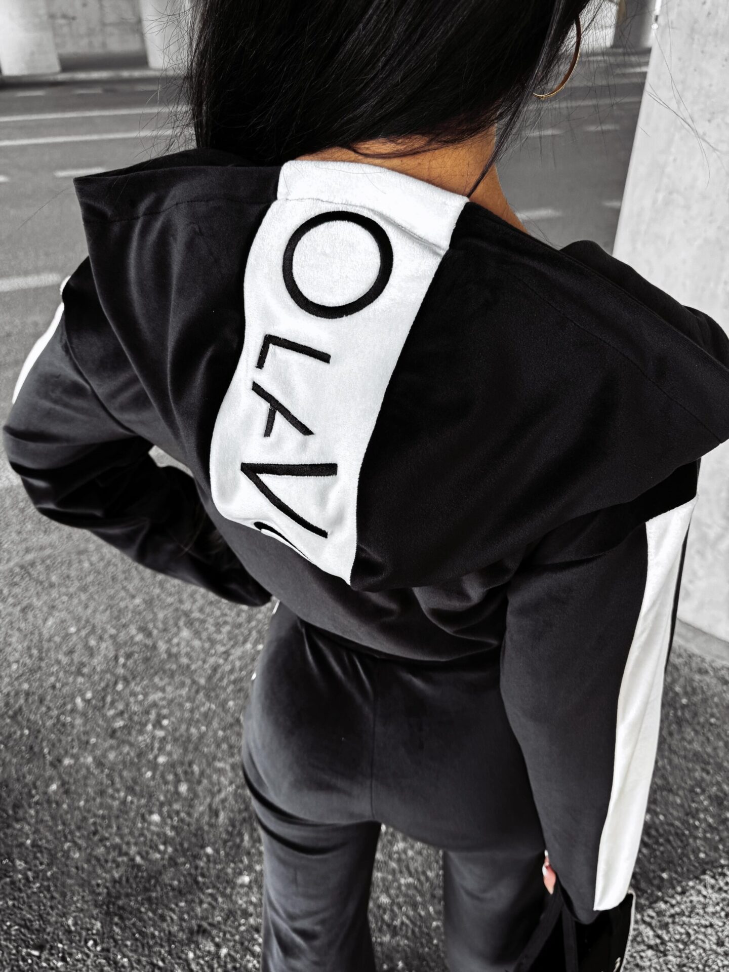 Dół kompletu to spodnie welurowe z elastycznym pasem i bocznymi kieszeniami, zapewniające pełen komfort oraz funkcjonalność. Ich dopasowany krój pięknie podkreśla linię nóg, a haftowane logo OLAVOGA na przodzie subtelnie dopełnia całość. Zestaw prezentuje się niezwykle kobieco, a dzięki efektownym lampasom z haftem 3D zyskuje sportowo–elegancki charakter.