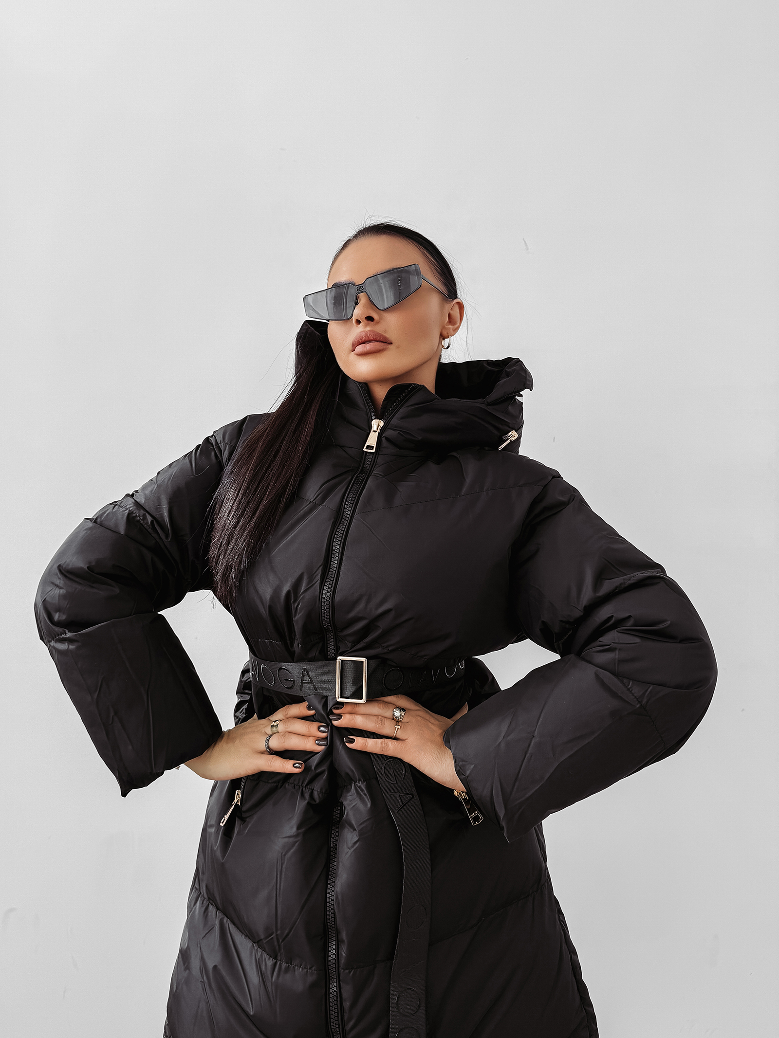 Każdy detal w kurtce został zaprojektowany celowo: długi fason chroni przed chłodem i wiatrem, pikowania dodają tekstury, a delikatny połysk materiału przyciąga subtelne światło. Kaptur z możliwością regulacji pozwala dopasować ochronę do aktualnej pogody. Wszyty suwak przy logo OLAVOGA daje pełną kontrolę nad jego widocznością, co pozwala dopasować styl do konkretnej stylizacji. Pasek z tłoczonym logo modeluje talię i dodaje wyrazistości, zaś złote elementy dopełniają luksusowego wyglądu bez przesady.