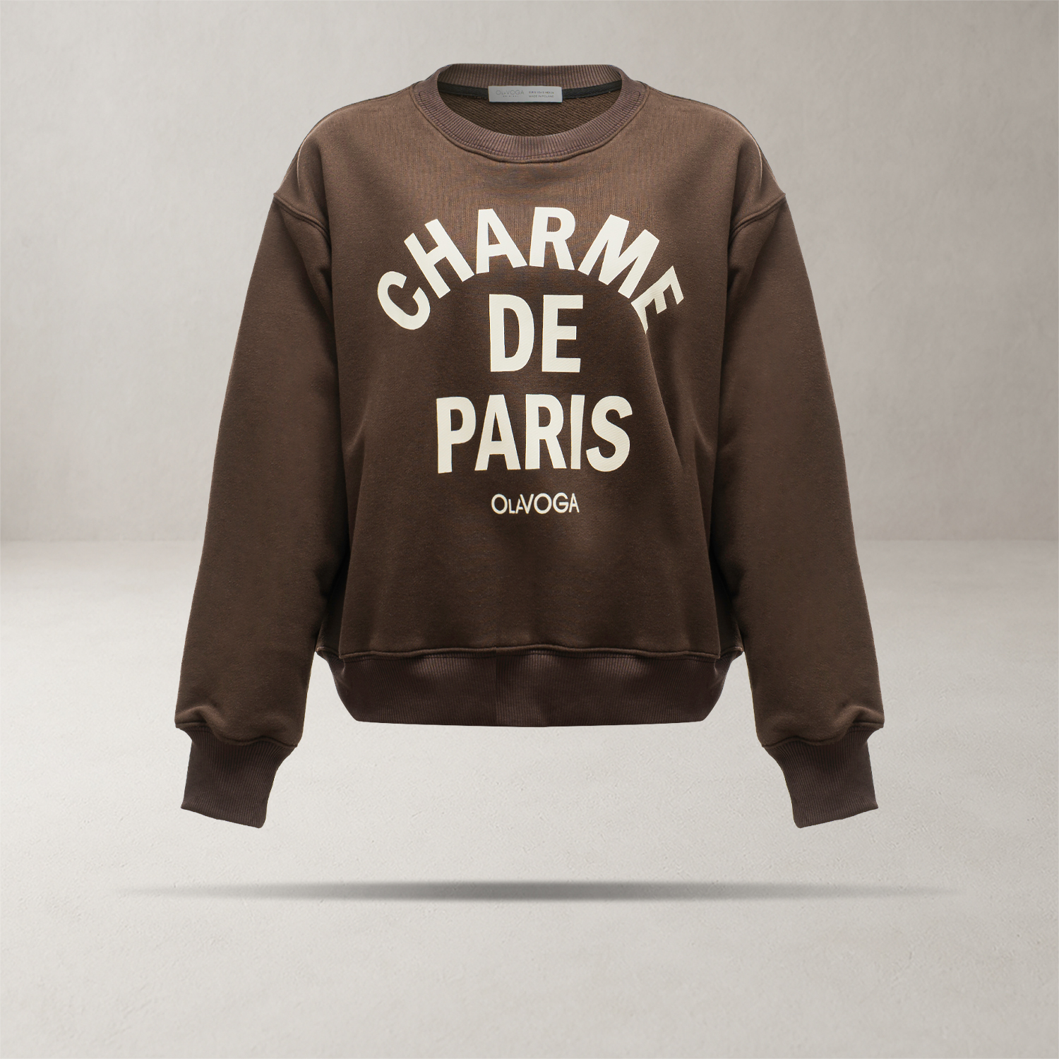 Ponadto na przodzie bluzy znajduje się charakterystyczny nadruk CHARME DE PARIS z logo OLAVOGA, który podkreśla markę oraz dodaje bluzie ekskluzywności. Na brzegach bluzy zastosowano prążkowane ściągacze, które utrzymują fason i zapobiegają jego deformacji, co wpływa na estetykę oraz trwałość produktu.