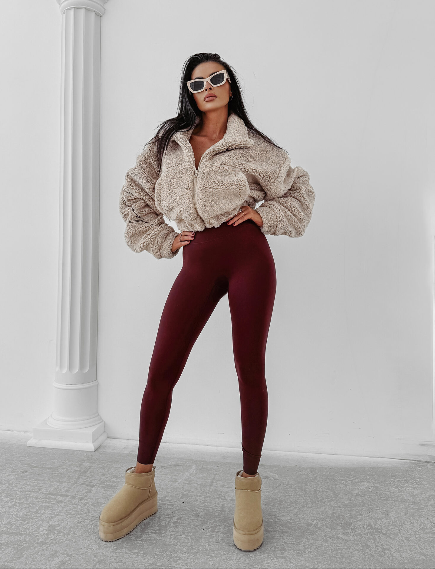 Model TEDI oferuje możliwość tworzenia stylizacji o nowoczesnym, nieco architektonicznym charakterze. Miękka struktura materiału teddy współgra z prostymi liniami spodni z wysokim stanem, legginsami o gładkiej powierzchni oraz denimowymi sylwetkami.