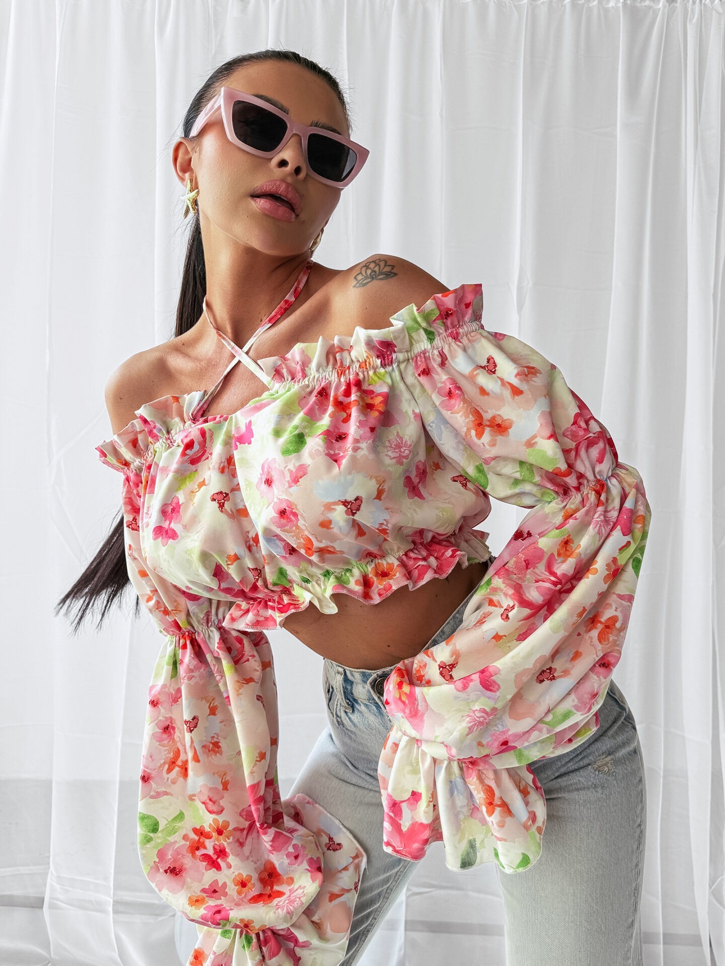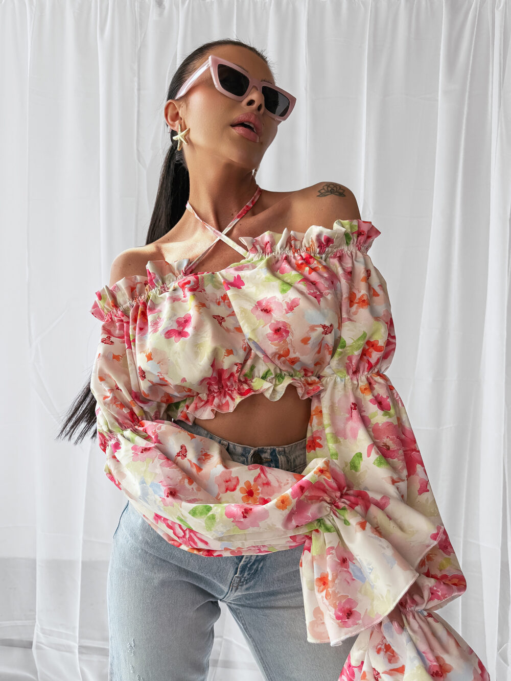 Bluzka GENTLE OLAVOGA to kwintesencja kobiecej elegancji w romantycznym wydaniu. Model typu hiszpanka zachwyca delikatnym, kwiatowym printem, który nadaje stylizacji subtelnego uroku. Wykonana z lekkiego, oddychającego materiału z domieszką wiskozy, zapewnia komfort noszenia przez cały dzień. Bufiaste rękawy dodają bluzce lekkości i szyku, a fason eksponujący ramiona podkreśla kobiecą sylwetkę. Doskonała propozycja na wyjątkowe okazje i codzienne stylizacje w stylu boho.