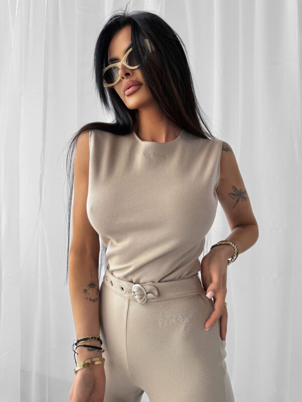 Komplet SERENDIPITY OLAVOGA to idealne połączenie komfortu i stylu. Wykonany z wysokiej jakości elastycznej bawełny, zapewnia wygodę i doskonałe dopasowanie do sylwetki. Góra to przylegający top bez rękawów, który wyróżnia się efektownym rozcięciem na plecach oraz regulowaną talią, podkreślającą figurę. Na przodzie umieszczony został subtelny haft z logo marki OLAVOGA, dopasowany kolorystycznie do wariantu produktu. Dół to stylowe spodnie z rozszerzanymi nogawkami, które optycznie wydłużają sylwetkę. Regulowana talia gwarantuje idealne dopasowanie, a minimalistyczny haft z logo brandu nadaje całości wyjątkowego charakteru.