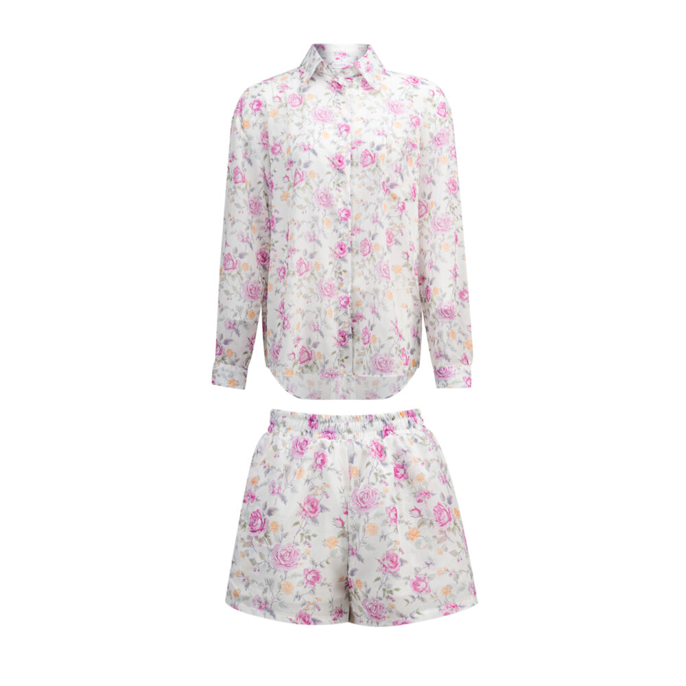 Dół zestawu stanowią krótkie, zwiewne spodenki z elastyczną gumą w pasie, które dopasowują się do sylwetki, nie uciskając i zapewniając pełną swobodę ruchów. Dzięki kieszeniom po bokach spodenki zyskują na funkcjonalności, idealnie sprawdzając się w codziennym użytkowaniu. Całość zestawu zdobi delikatny, kobiecy motyw kwiatowy, który nadaje stylizacji lekkości i subtelnego romantyzmu – idealnego na lato.