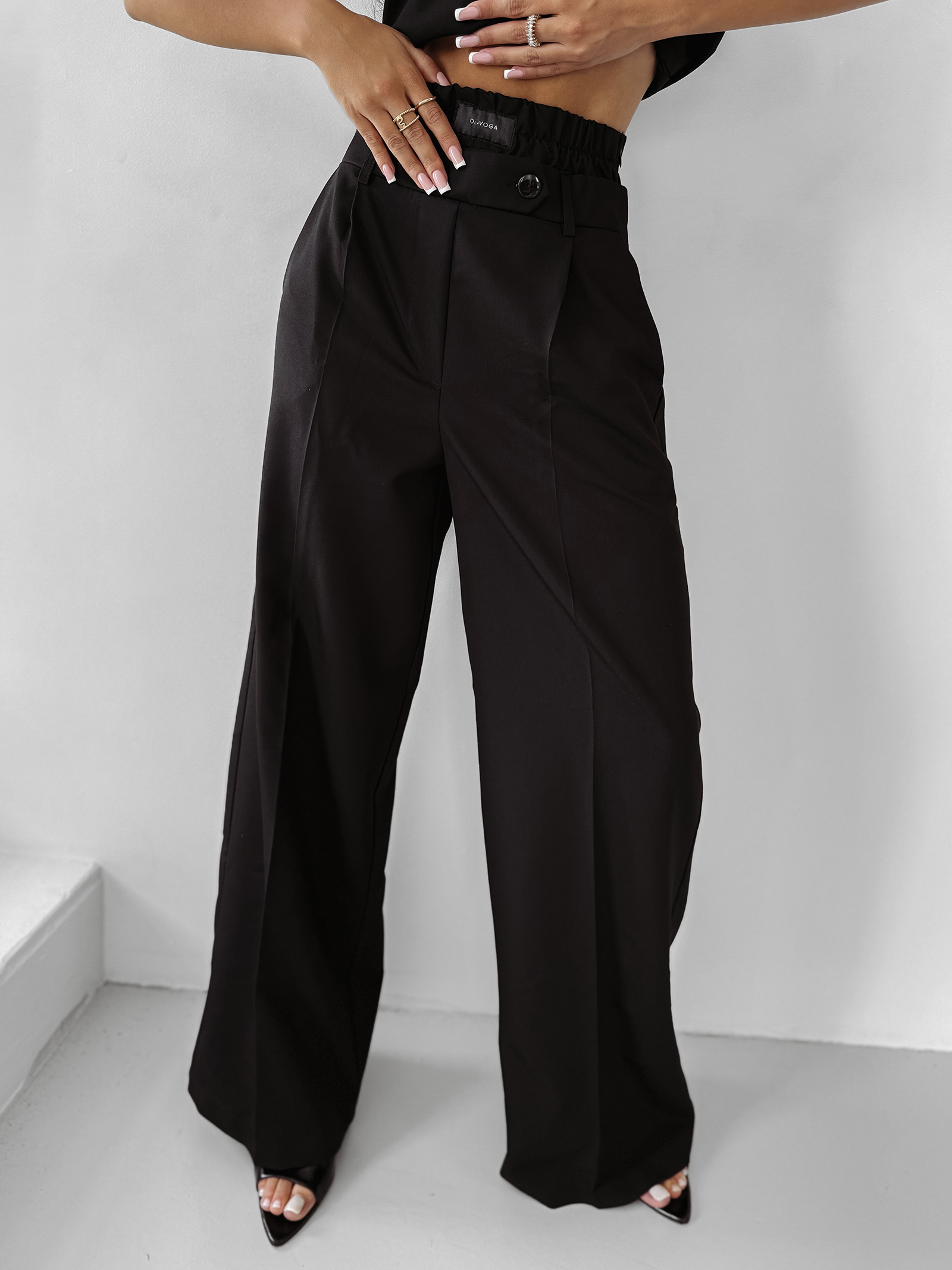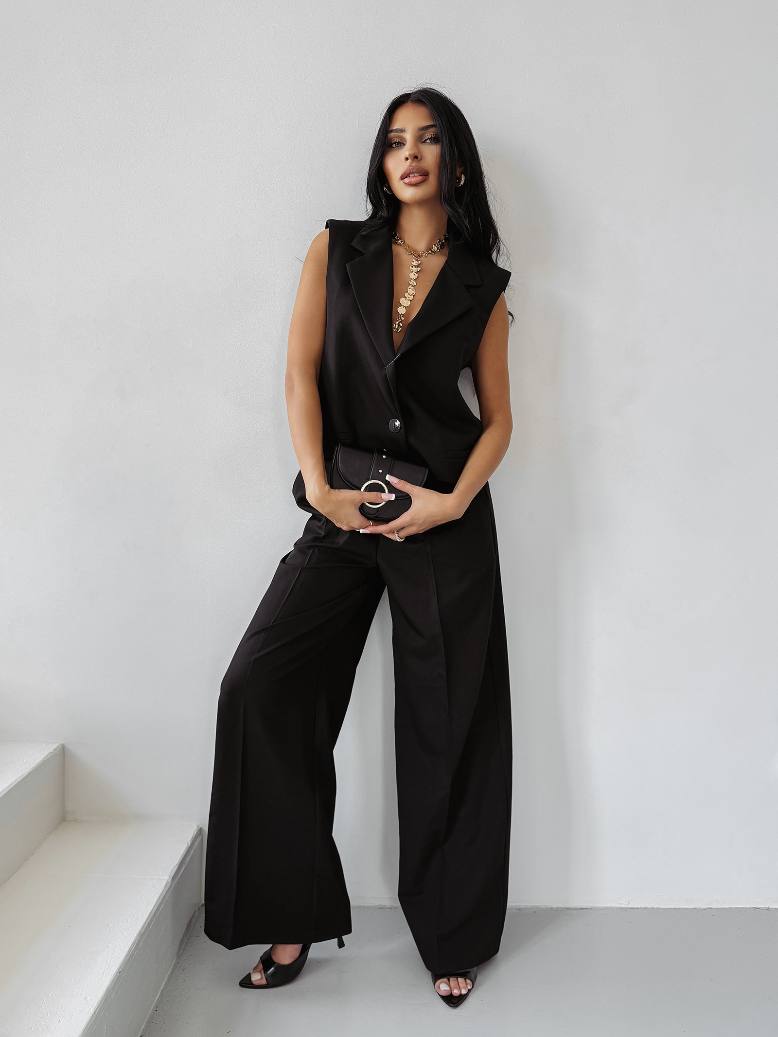 Elegancja i komfort mogą iść w parze – doskonałym przykładem jest komplet damski OLAVOGA MAJESTY. Wykonany z wysokiej jakości garniturowego materiału, łączy klasyczny design z nowoczesnym fasonem. Kamizelka z klapami i zapięciem na guzik subtelnie podkreśla sylwetkę, a spodnie z szerokimi nogawkami i elastycznym pasem zapewniają pełną wygodę i swobodę ruchów.