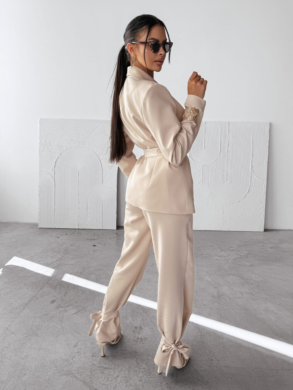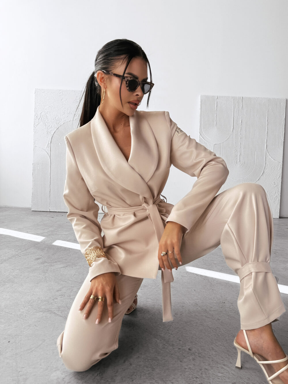 Komplet MARGARITA OLAVOGA to elegancka propozycja dla kobiet ceniących klasyczny styl z nowoczesnym akcentem. Góra to taliowana marynarka wykonana z wysokiej jakości garniturowego materiału, z wiązaniem w talii, które podkreśla kobiecą sylwetkę. Poduszki na ramionach dodają całości elegancji i charakteru. Na jednym z rękawów znajduje się subtelna naszywka z logo OLAVOGA. Dół to casualowe spodnie z nogawkami rozszerzanymi ku dołowi, wiązane przy kostce, które nadają całości lekkości i modowego sznytu. Spodnie posiadają kieszenie po bokach oraz logowaną naszywkę w talii, co dopełnia całość. Komplet doskonały na eleganckie wyjścia, jak i mniej formalne spotkania.