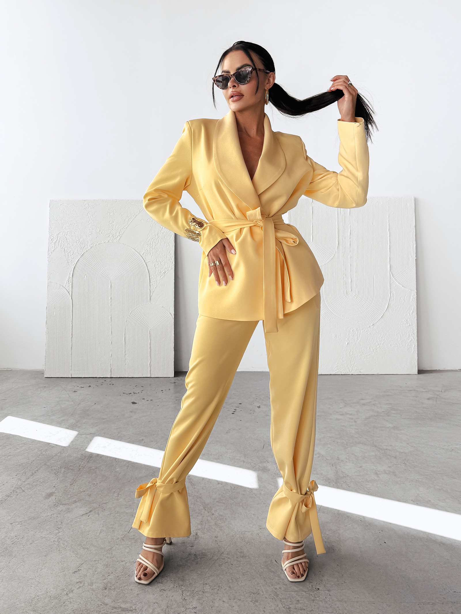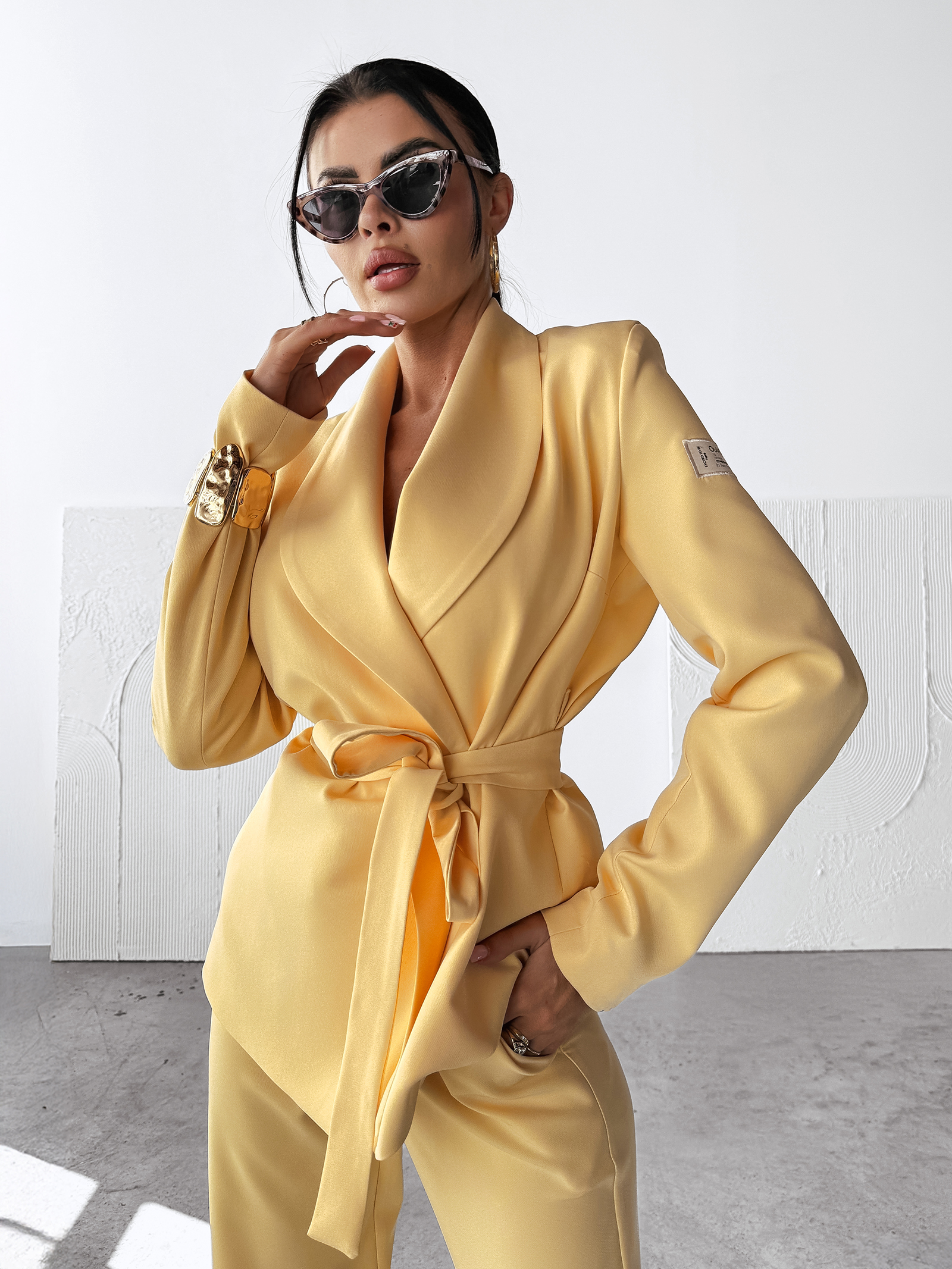Komplet MARGARITA OLAVOGA to elegancka propozycja dla kobiet ceniących klasyczny styl z nowoczesnym akcentem. Góra to taliowana marynarka wykonana z wysokiej jakości garniturowego materiału, z wiązaniem w talii, które podkreśla kobiecą sylwetkę. Poduszki na ramionach dodają całości elegancji i charakteru. Na jednym z rękawów znajduje się subtelna naszywka z logo OLAVOGA. Dół to casualowe spodnie z nogawkami rozszerzanymi ku dołowi, wiązane przy kostce, które nadają całości lekkości i modowego sznytu. Spodnie posiadają kieszenie po bokach oraz logowaną naszywkę w talii, co dopełnia całość. Komplet doskonały na eleganckie wyjścia, jak i mniej formalne spotkania.