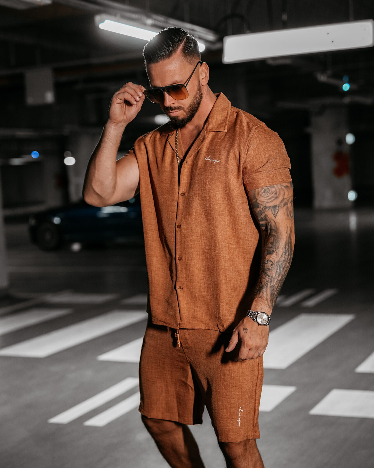 Komplet HEARTS OLAVOGA to casualowa propozycja dla mężczyzn, którzy cenią sobie komfort i styl w codziennych, niezobowiązujących stylizacjach. Wykonany z wysokiej jakości oddychającego materiału, komplet ten zapewnia wygodę przez cały dzień, umożliwiając skórze oddychanie, a jednocześnie zachowując lekkość i przyjemność noszenia. Góra kompletu to koszula z krótkim rękawem, która zapinana jest na guziki, co nadaje jej klasyczny, ale jednocześnie swobodny charakter. Na przodzie koszuli znajduje się subtelny haft z logo marki OLAVOGA, który jest eleganckim detalem podkreślającym wysoką jakość wykonania. Dół kompletu to krótkie spodenki z regulowaną talią, co pozwala na idealne dopasowanie do sylwetki i zapewnia pełny komfort, niezależnie od tego, czy spędzasz dzień na świeżym powietrzu, czy odpoczywasz w domu. Spodenki wyposażone są w kieszenie zarówno z przodu, jak i z tyłu, co dodaje im funkcjonalności. Dodatkowo, na jednej z nogawek znajduje się haft z logo brandu, który subtelnie wyróżnia ten model na tle innych casualowych kompletów. Komplet HEARTS OLAVOGA to doskonały wybór na letnie dni, weekendowe wypady czy spotkania ze znajomymi, łącząc wygodę z modnym wyglądem. Jest to odzież, która sprawdzi się zarówno w codziennych stylizacjach, jak i będzie świetną bazą Twojego wakacyjnego looku!