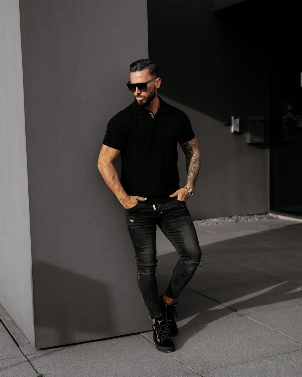 - Nowoczesny krój z krótkim rękawem i głębszym dekoltem – łączy wygodę z męskim stylem.