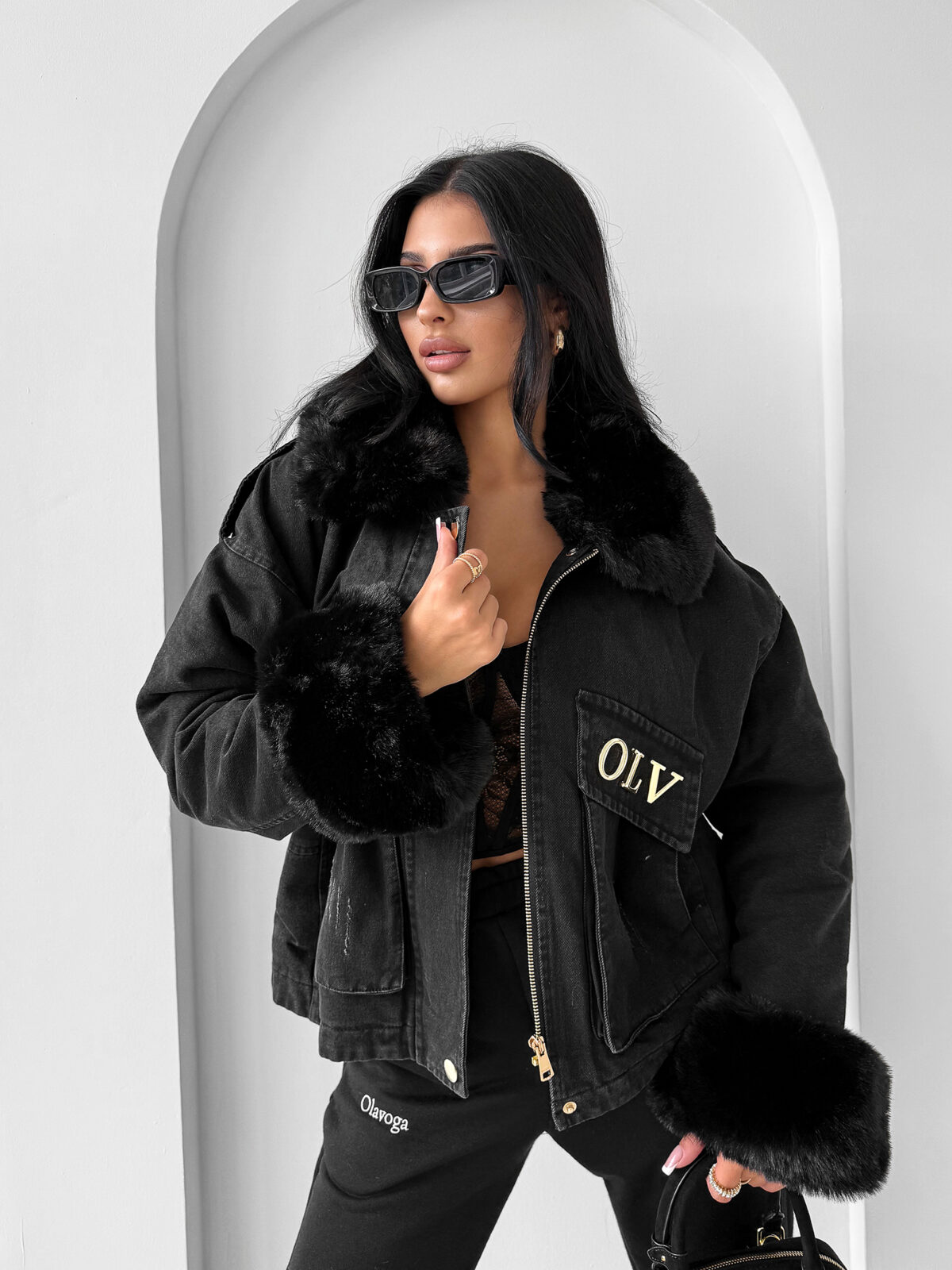 Front kurtki ozdobiony jest metalowym suwakiem błyskawicznym, który oprócz praktycznej funkcji, pełni rolę stylowego detalu. Z przodu widoczna jest także złota blaszka z logo OLV, natomiast na plecach znajduje się duży haft OLAVOGA, stanowiący wyrazisty znak rozpoznawczy marki i gwarancję jakości.