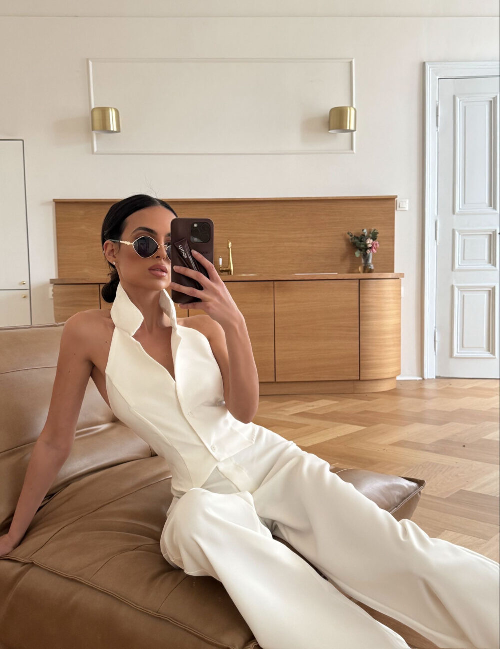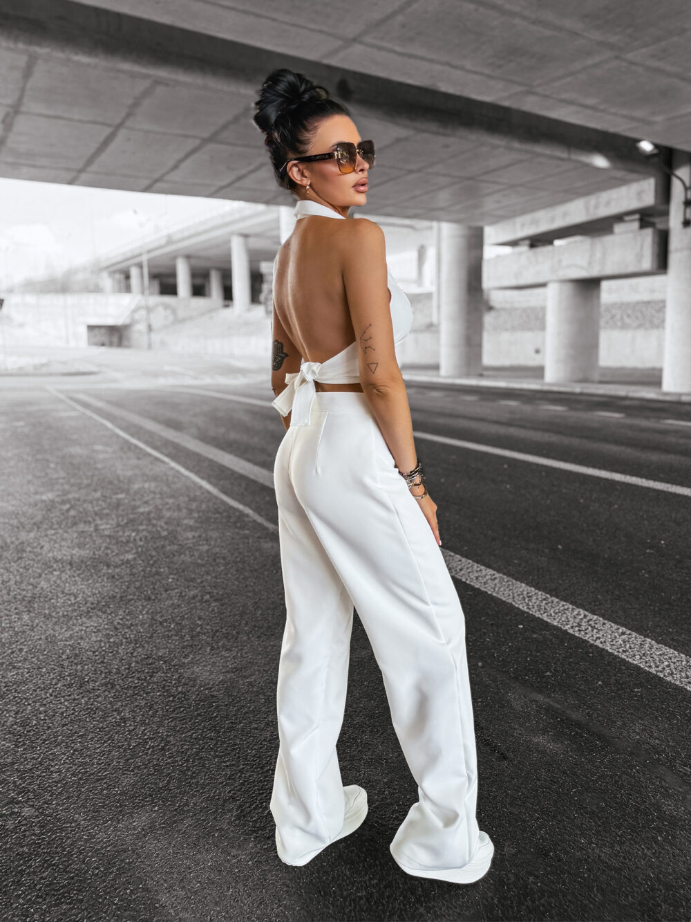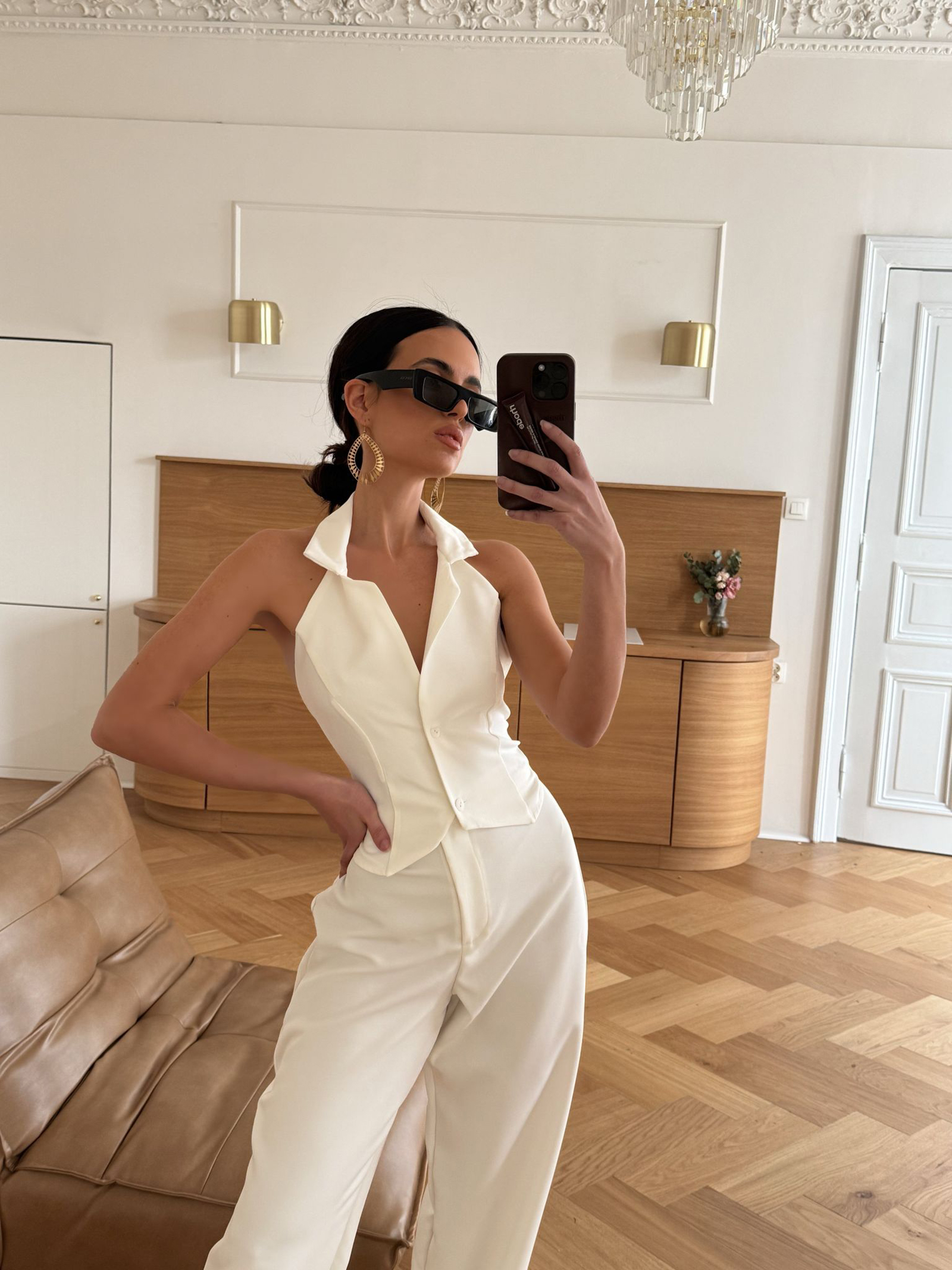 Komplet NICE OLAVOGA składa się z dwóch idealnie skrojonych elementów: modnej kamizelki oraz eleganckich spodni z wysokim stanem. Górna część zestawu to kamizelka z kołnierzem, która dodaje całości charakteru i wyjątkowego szyku. Wiązanie z tyłu pozwala indywidualnie dopasować fason do sylwetki, co nie tylko podkreśla talię, ale także zapewnia komfort noszenia i idealne ułożenie materiału.