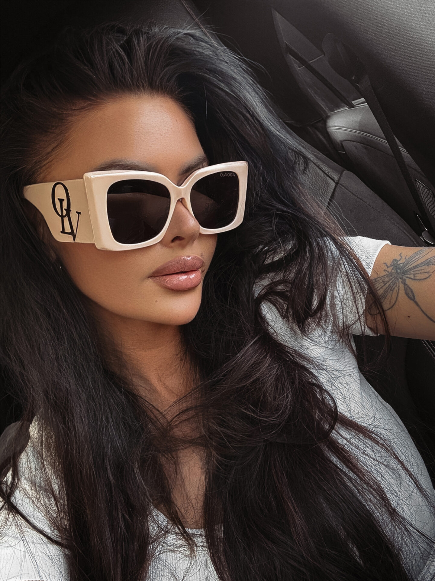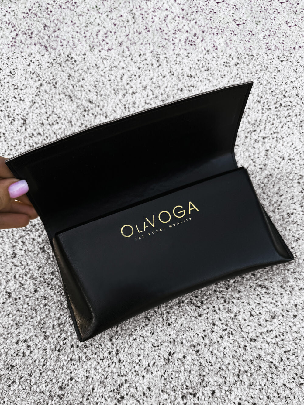 Szerokie zauszniki zostały ozdobione subtelnym, ale luksusowym detalem – złotym, metalicznym logo OLV, które przyciąga spojrzenia i jednoznacznie wskazuje na przynależność do ekskluzywnej marki OLAVOGA. To właśnie ten detal sprawia, że okulary zyskują wyjątkowy, premium charakter, idealny do stylu glamour lub miejskiego szyku.