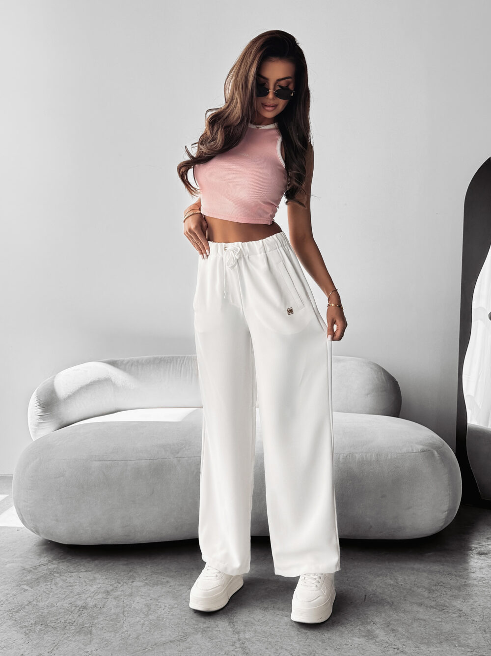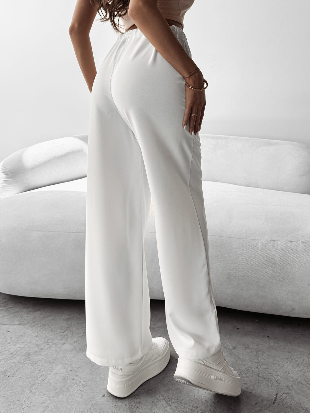 Wysoki stan to jeden z największych atutów spodni MIAL. Dzięki niemu talia jest pięknie podkreślona, a nogi optycznie wydłużone. To rozwiązanie, które doskonale wpisuje się w najnowsze trendy i jednocześnie działa na korzyść każdej sylwetki – niezależnie od typu figury. W połączeniu z rozszerzanymi nogawkami, które delikatnie opadają ku dołowi, tworzą one zbalansowaną, elegancką linię, która wysmukla i dodaje lekkości całej stylizacji.