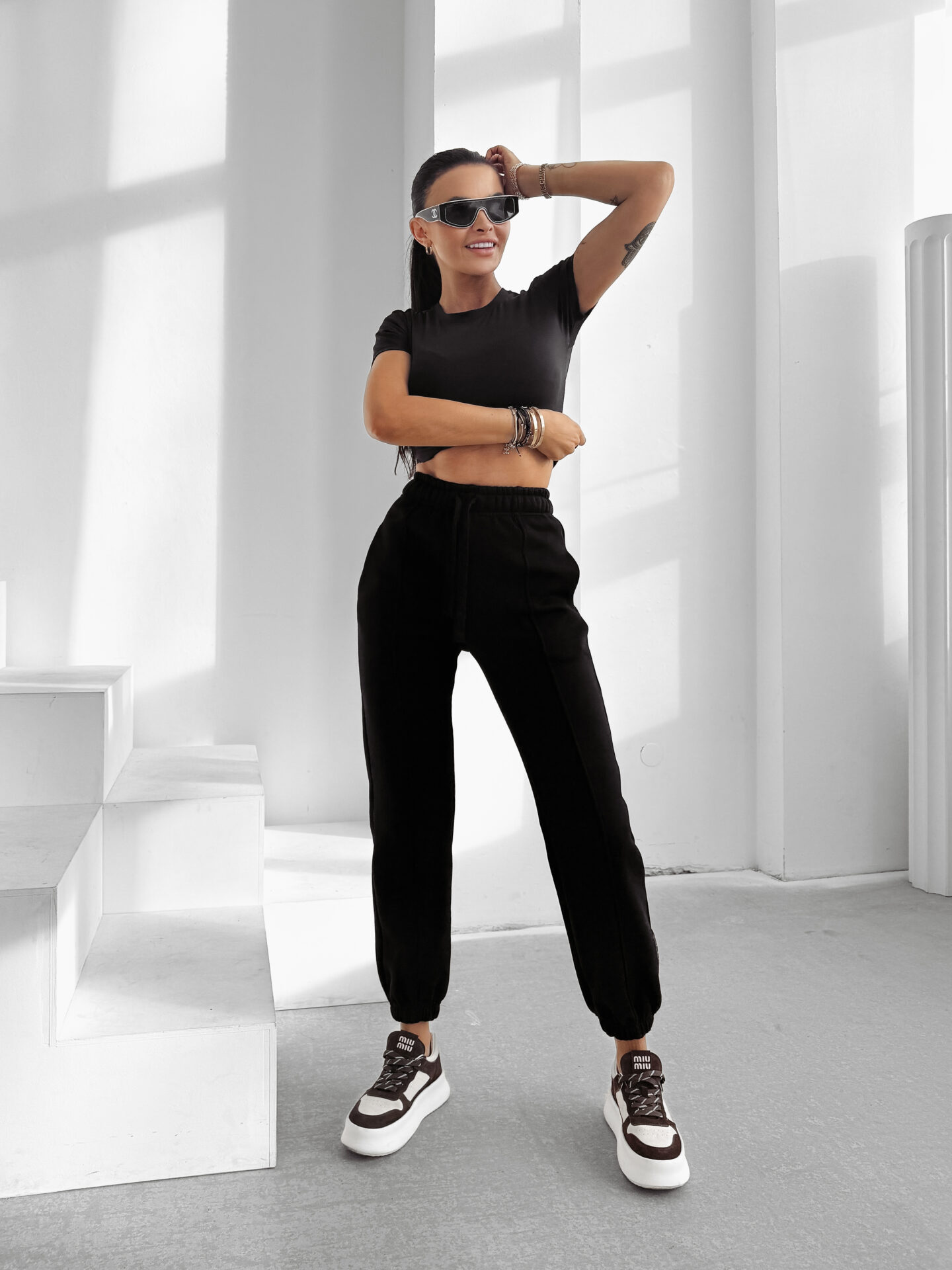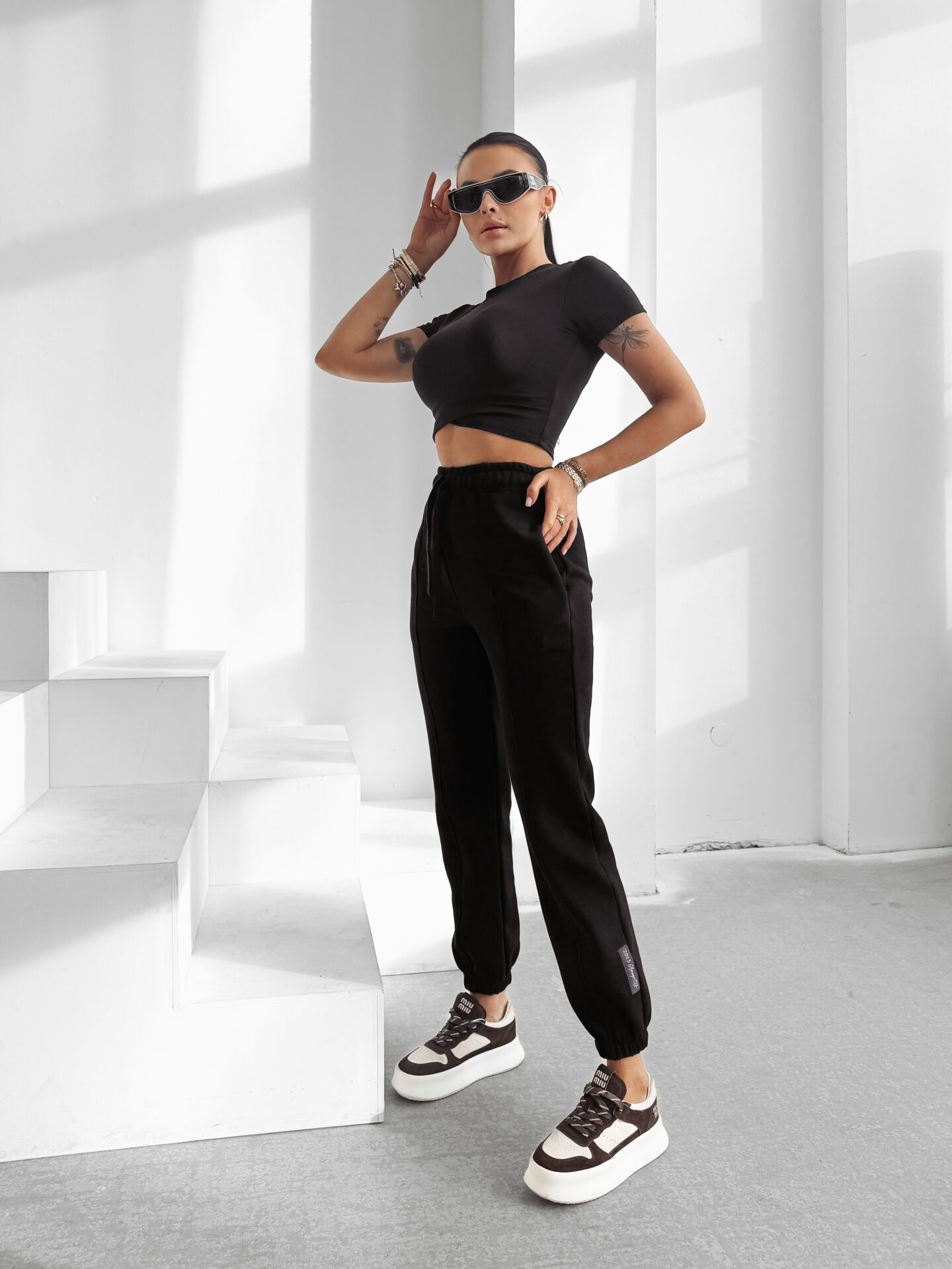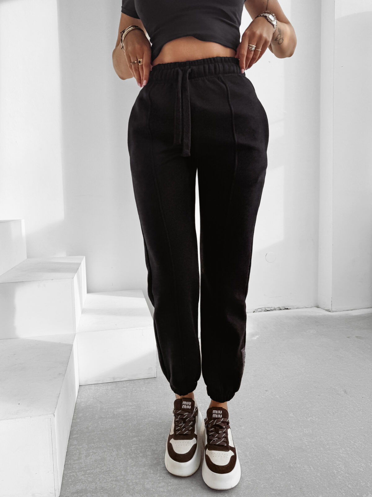 Model TELO wyróżnia się minimalistyczną logowaną naszywką umieszczoną na jednej z nogawek, która subtelnie uzupełnia całość, nadając jej luksusowego charakteru. Przeszycia obecne na całej konstrukcji podkreślają modowy, ekskluzywny styl, jednocześnie wprowadzając efekt optycznego wysmuklenia nóg. Sportowy krój zyskuje dzięki temu zupełnie nową, glamour interpretację, która pięknie łączy lekkość i zmysłowość w jednym projekcie.