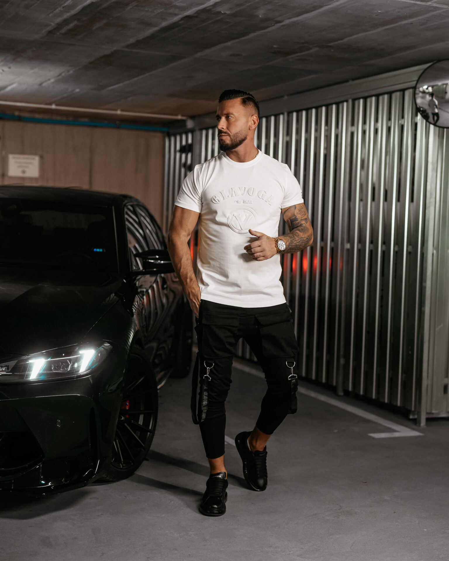 Przód koszulki zdobi tłoczone logo OLAVOGA ORIGINAL, które dzięki swojej strukturze dodaje projektowi wyjątkowej głębi i nowoczesnego wyrazu. Emblemat w kształcie litery V nadaje całości charakteru, który wyróżnia model RAVEN na tle klasycznych T-shirtów. Na rękawie umieszczono subtelną, złotą aplikację z logo brandu, która tworzy prestiżowy akcent i podkreśla modowy charakter produktu. Starannie dopracowane detale sprawiają, że koszulka staje się kluczowym elementem wielu stylizacji.