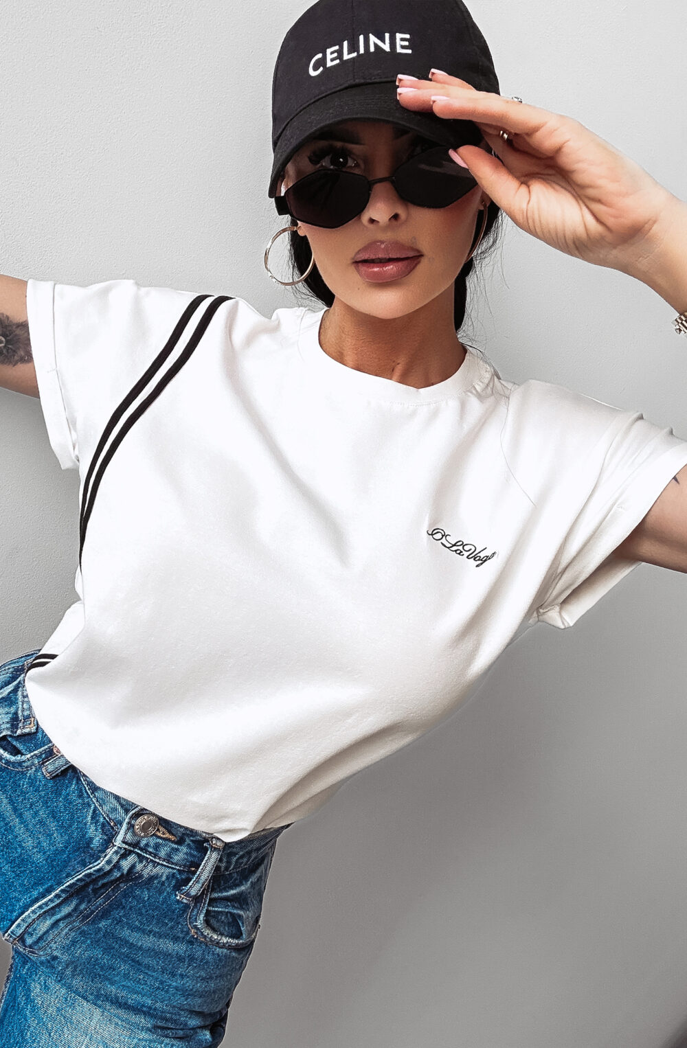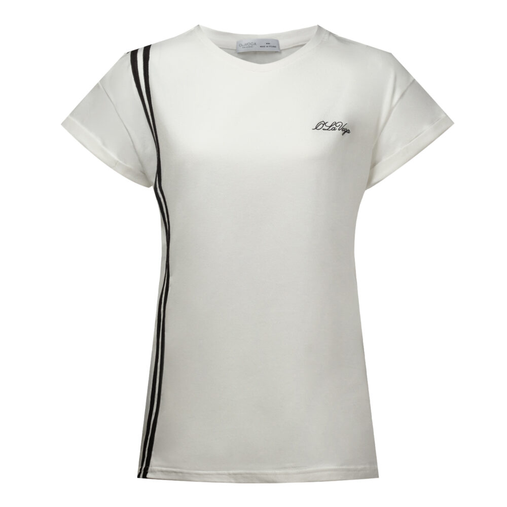 Klasyczny, a zarazem stylowy T-shirt RISCE OLAVOGA to propozycja dla kobiet ceniących wygodę i modny design. Model o taliowanym kroju, wykonany z elastycznej bawełny, perfekcyjnie dopasowuje się do sylwetki. Krótkie rękawy z subtelnym podwinięciem oraz haftowane logo OLAVOGA na przodzie dodają mu wyjątkowego charakteru. Podwójny lampas wzdłuż koszulki to oryginalny detal, który wyróżnia ten model na tle innych. Idealny na co dzień oraz do casualowych stylizacji z nutą elegancji