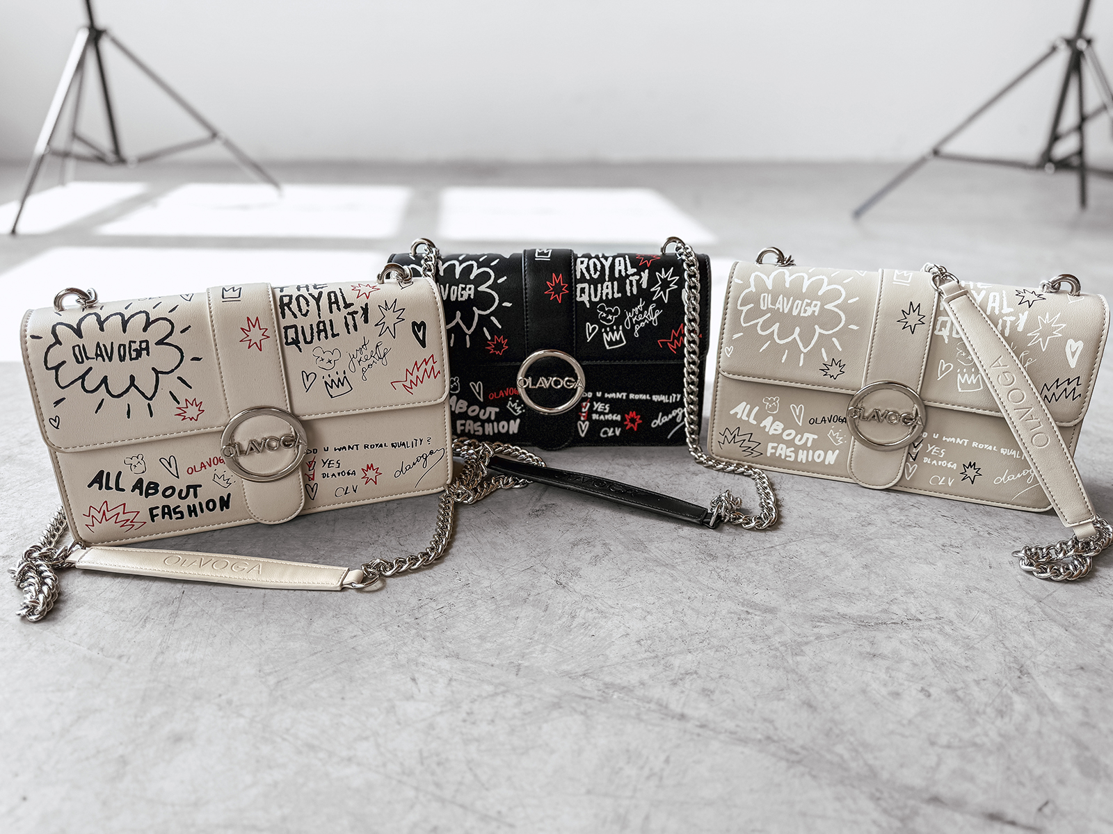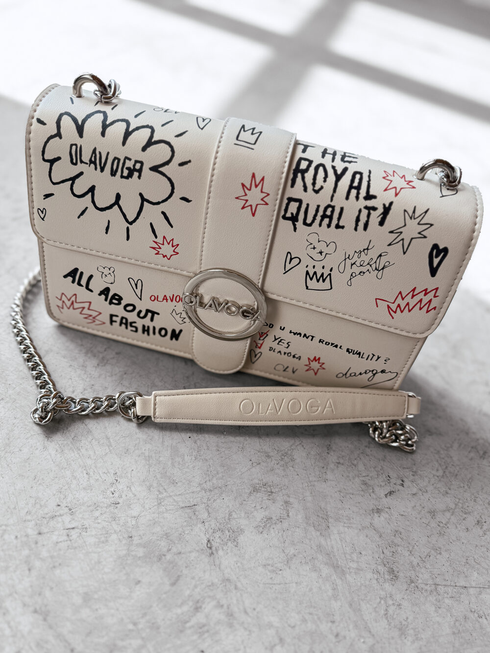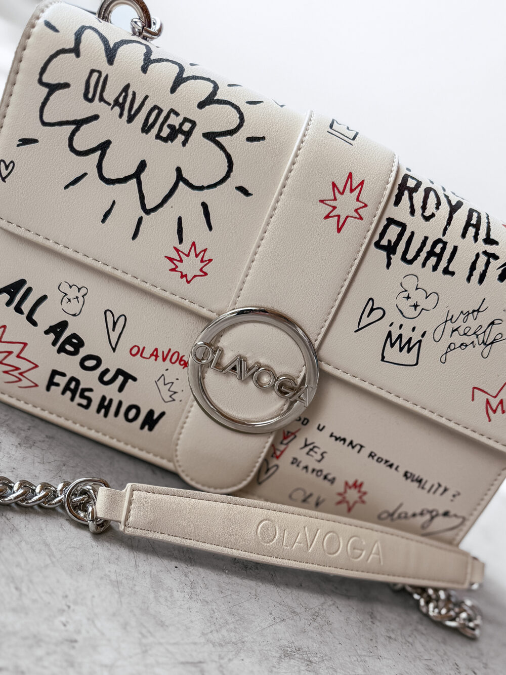 Na przednim panelu znajduje się tłoczone logo OLAVOGA osadzone w metalowym okręgu, które przyciąga wzrok i dodaje klasy. Całość uzupełniają nadruki w stylu graffiti, które nadają torebce artystycznego, buntowniczego charakteru – to idealny dodatek dla kobiet, które nie boją się wyrażać siebie poprzez modę.