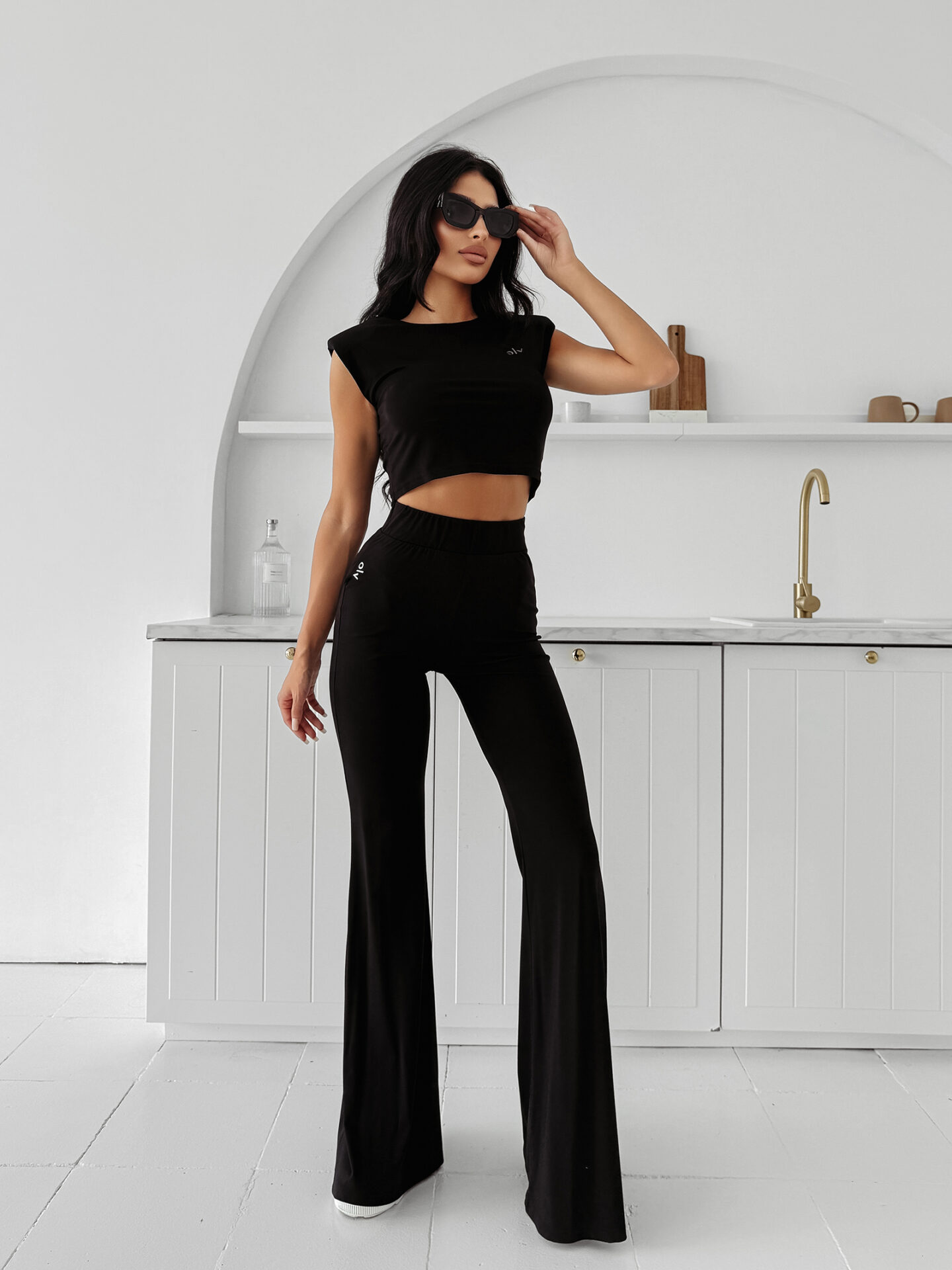 Legginsy z zestawu to absolutny must-have w szafie każdej kobiety. Wysoki stan świetnie trzyma się na sylwetce, podkreśla talię i sprawia, że legginsy idealnie dopasowują się do ciała. Dzięki rozszerzanym nogawkom, model wyróżnia się na tle klasycznych propozycji – dodaje lekkości, wydłuża optycznie nogi i nadaje stylizacji bardziej modowego charakteru. Guma w pasie zapewnia wygodę przez cały dzień, a nadruk OLV na nogawce dyskretnie sygnuje produkt jako część kolekcji OLAVOGA.