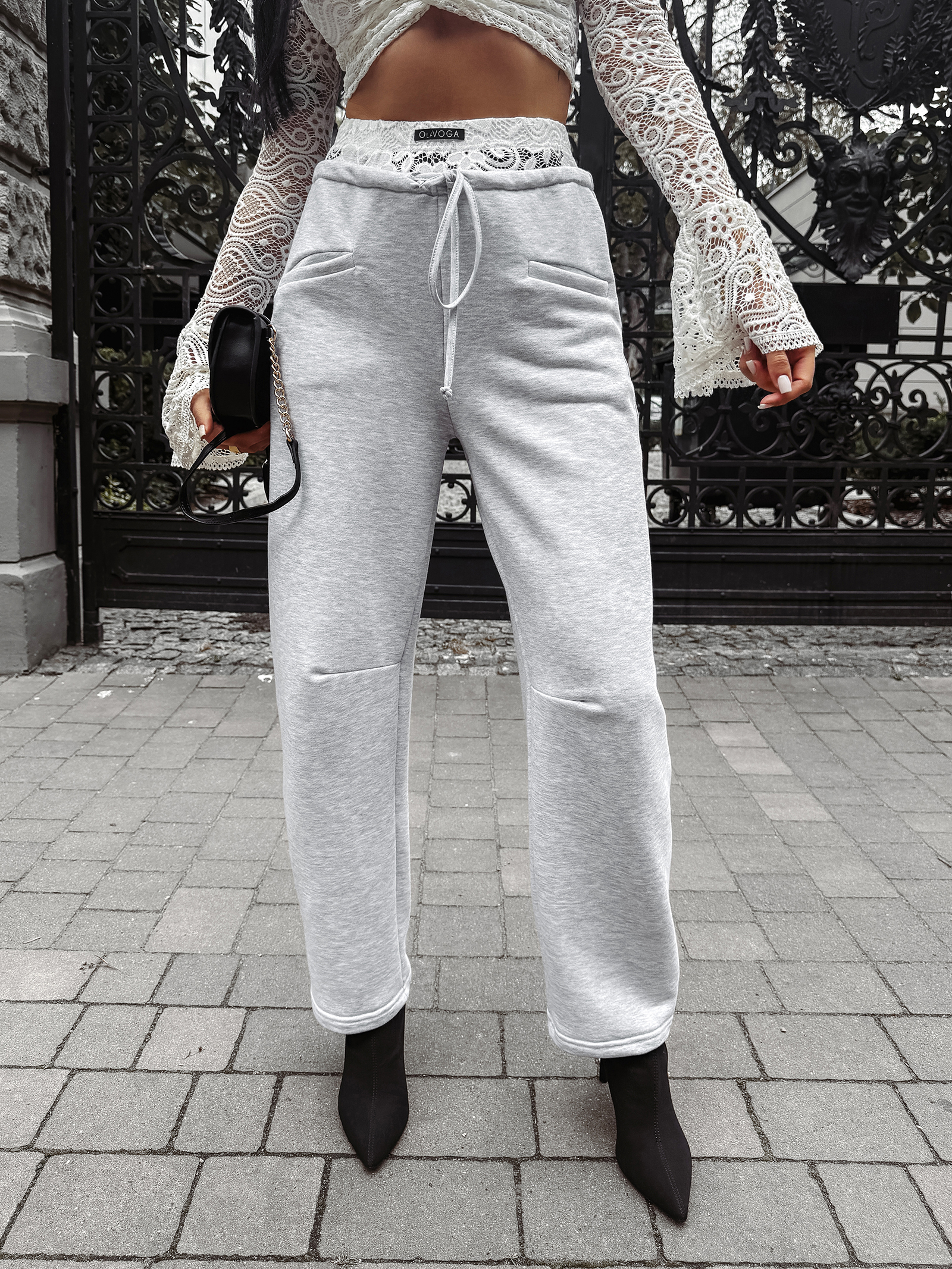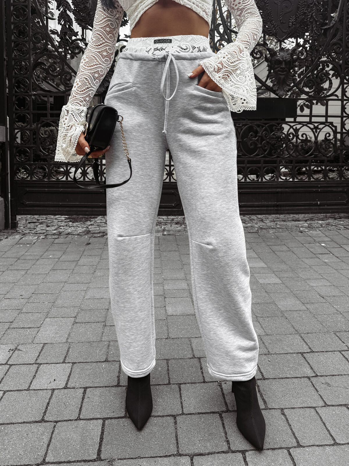 Czym się wyróżniają? Przede wszystkim oryginalnym wykończeniem. Na jednej z nogawek znajdziesz dodatkowy materiał w formie delikatnej koronki, który przełamuje sportowy charakter spodni i dodaje im subtelnej elegancji. To detal, który sprawia, że te spodnie idealnie odnajdą się również w bardziej stylowych zestawach. Na koronce naszyto subtelne logo marki OLAVOGA, które dopełnia całości i świadczy o najwyższej jakości wykończenia.