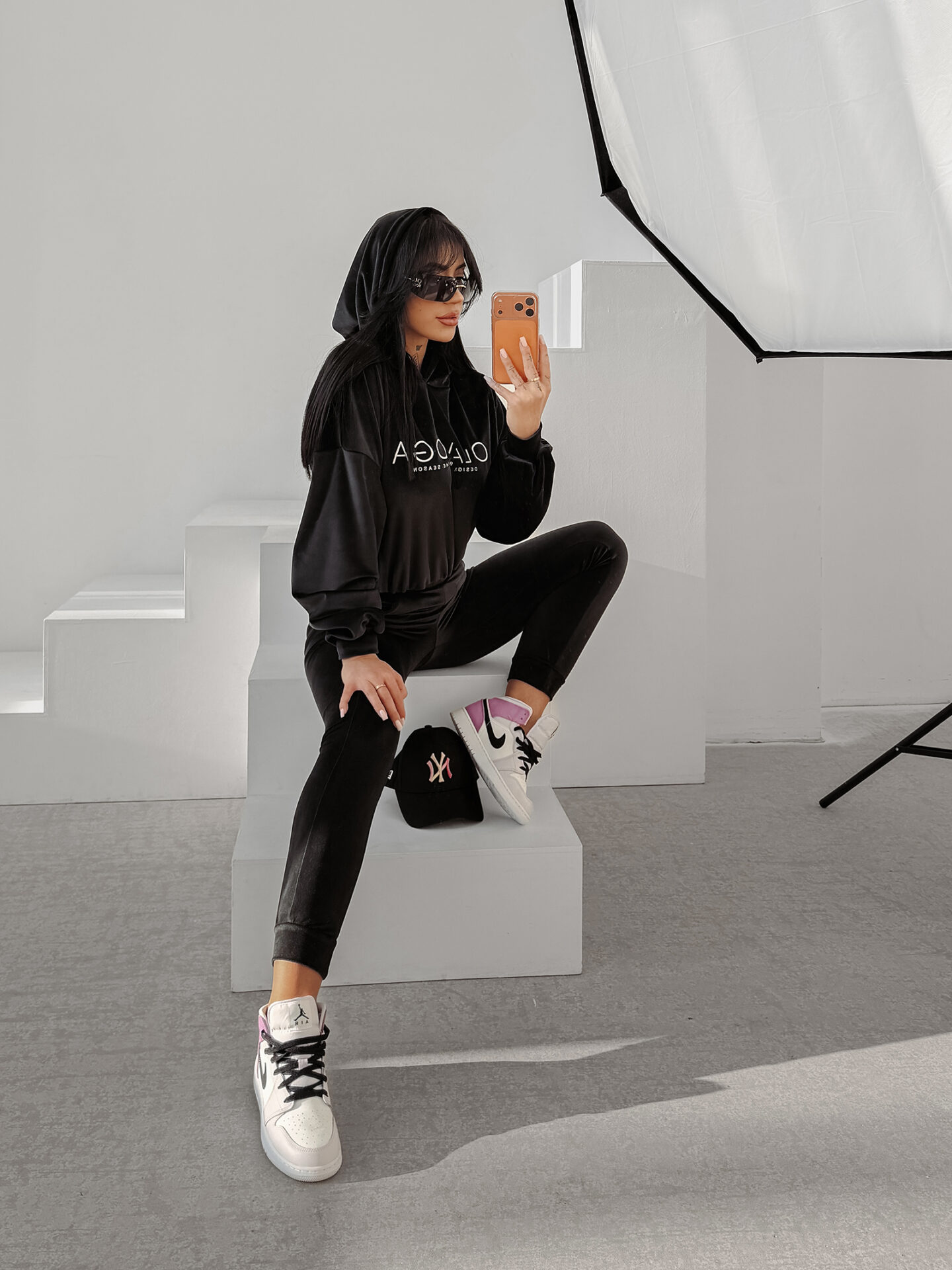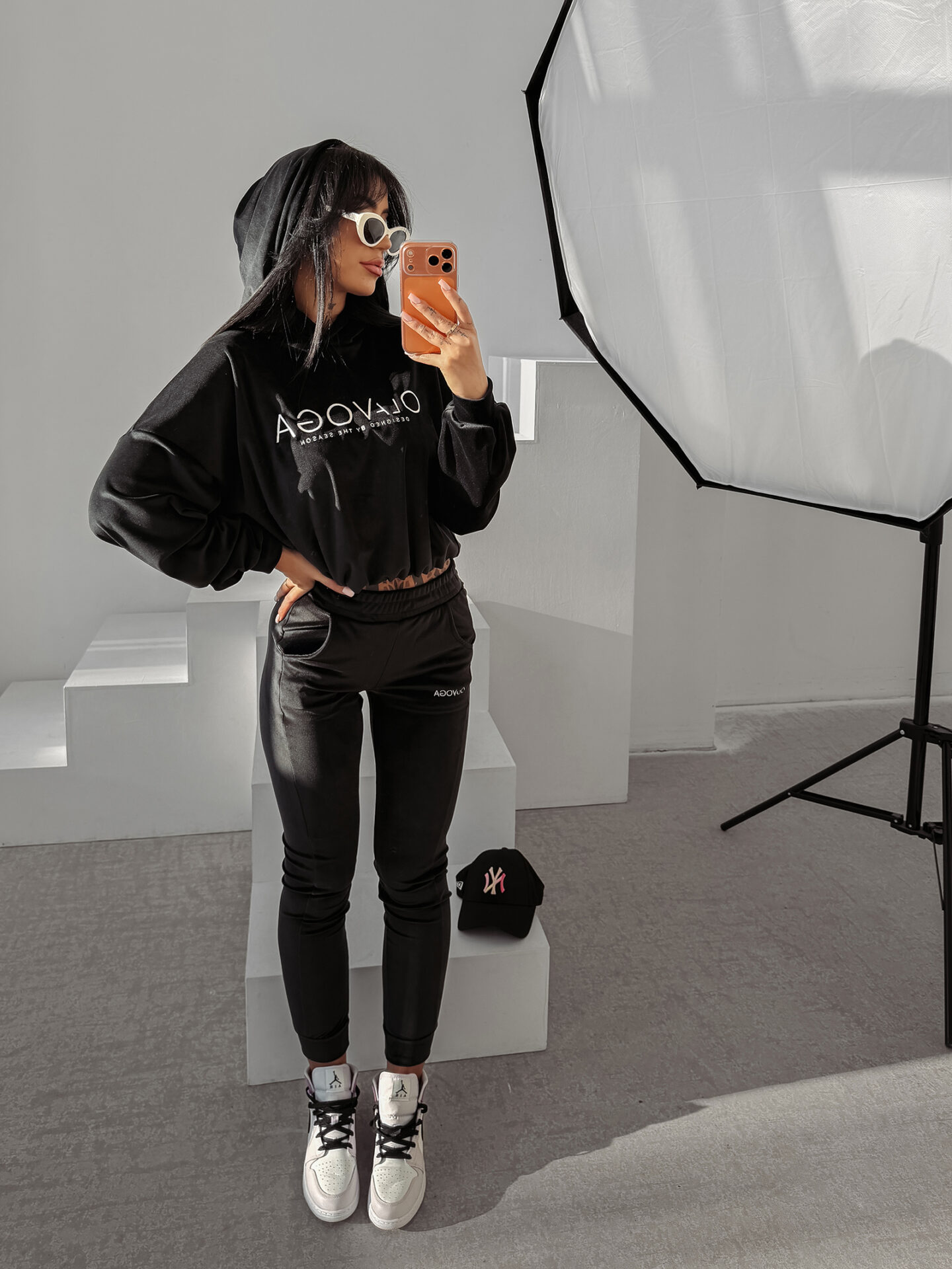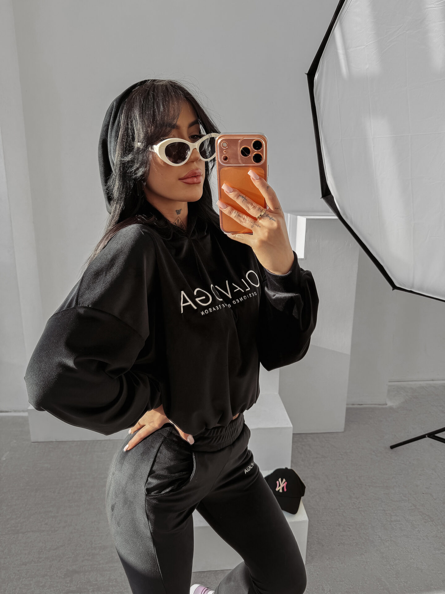 Spodnie w tym zestawie mają dopasowany krój, który delikatnie akcentuje sylwetkę. Elastyczna talia zapewnia wygodę i poczucie swobody, natomiast praktyczne kieszenie są funkcjonalnym dodatkiem w codziennym użytkowaniu. Nogawki zakończono miękkimi ściągaczami, które stabilizują fason i subtelnie wydłużają linię nóg. Logo OLAVOGA na nogawce stanowi starannie dobrany detal.