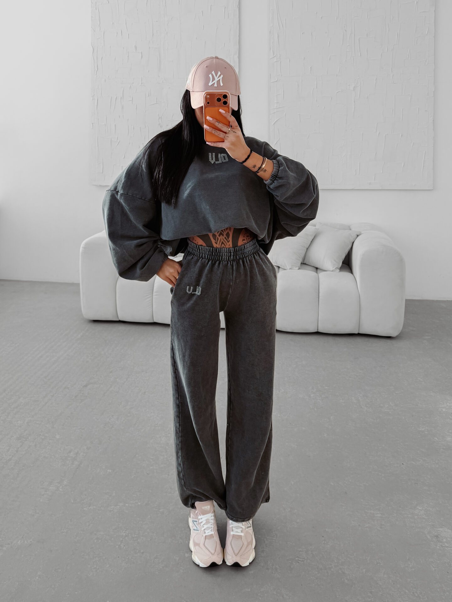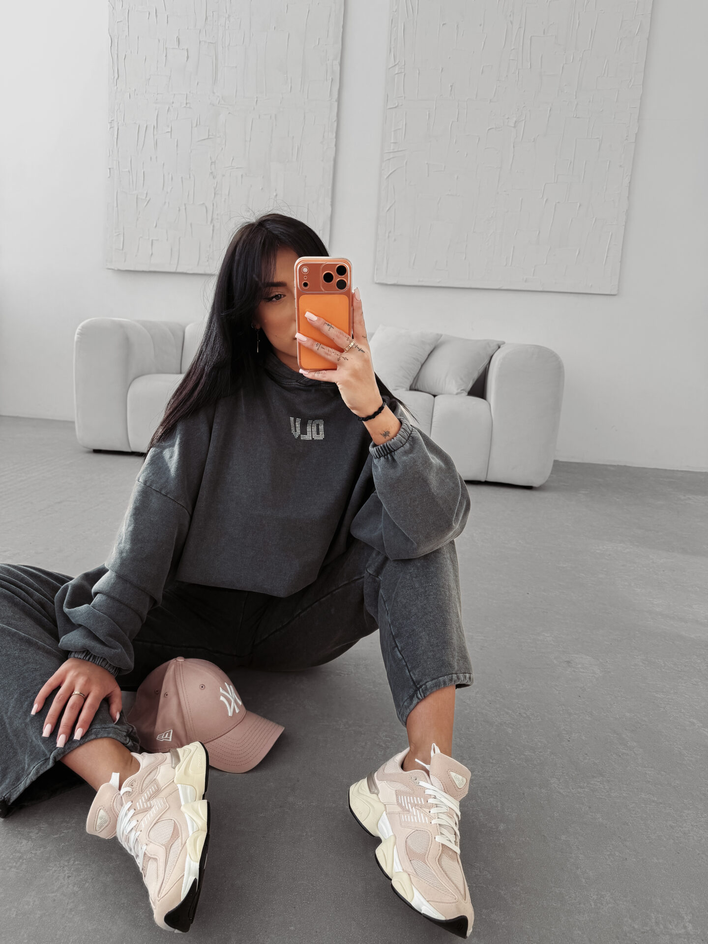 Komplet STONY szary można nosić z eleganckimi płaszczami, lekkimi puchówkami, minimalistycznymi trampkami lub klasycznymi sneakersami. Możliwości są niemal nieograniczone, ponieważ szarość w modzie premium pełni rolę koloru, który elegancko równoważy każdy element stylizacji.