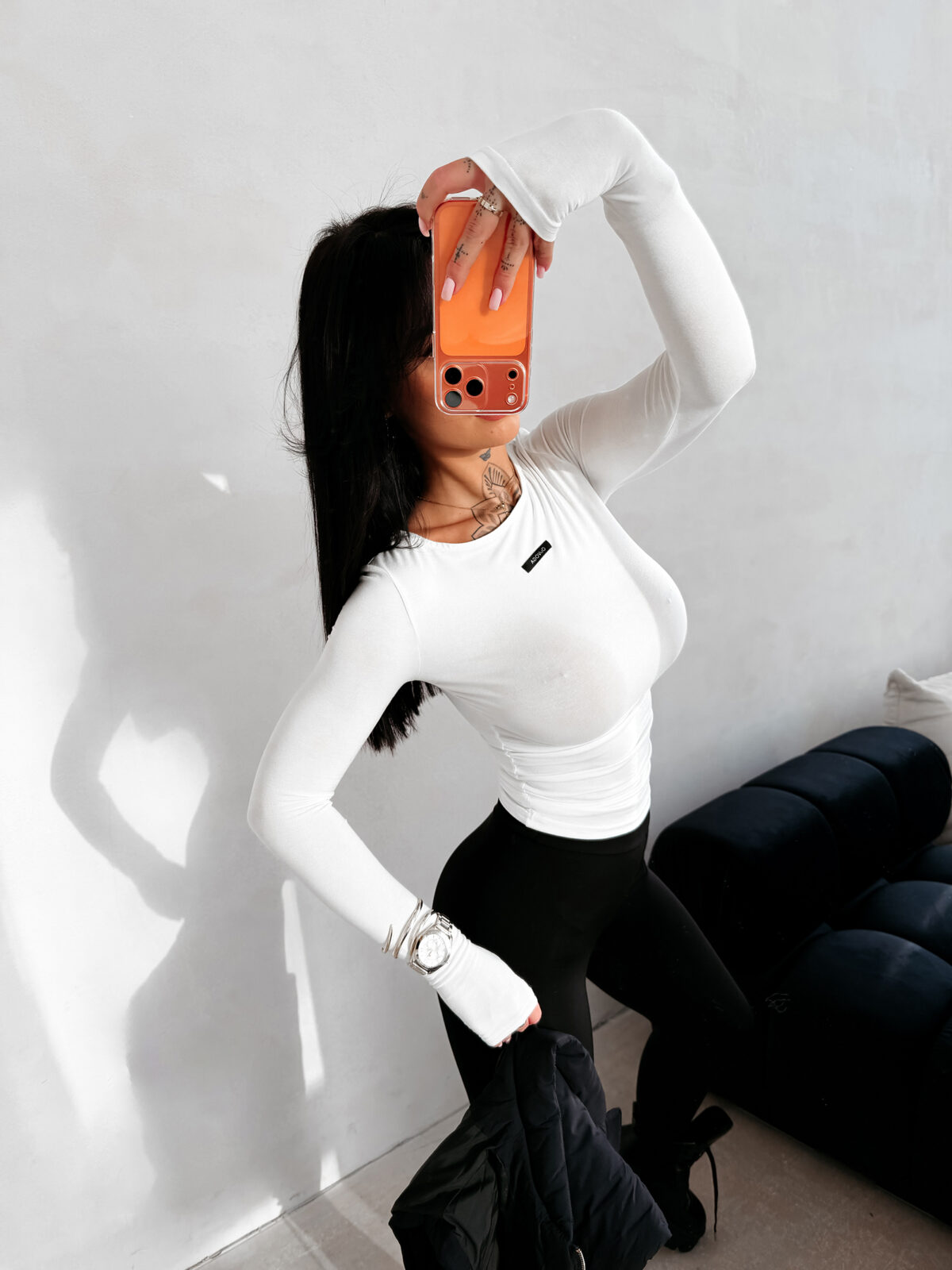 Bluzkę zdobi czarna naszywka z logo OLAVOGA, która doskonale wpisuje się w styl minimalistycznej elegancji. To detal, który nie dominuje stylizacji, lecz dodaje jej klasy i nowoczesności.