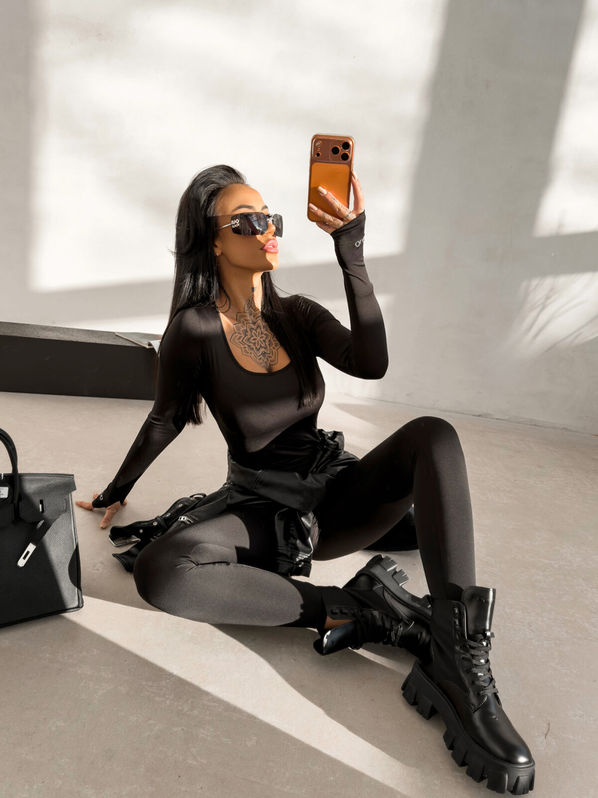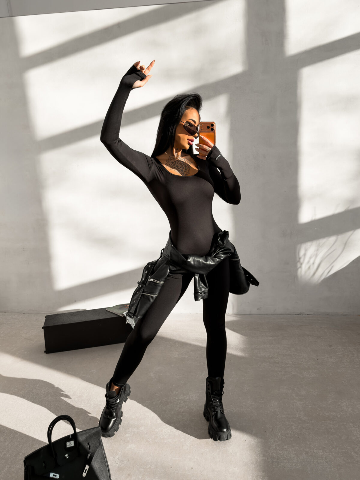 Długie rękawy zakończone wycięciem na kciuk zwiększają wygodę i stabilność podczas noszenia, a jednocześnie dodają całości nowoczesnego charakteru. Głęboki dekolt optycznie wysmukla górną część sylwetki, zachowując przy tym estetyczną równowagę. Materiał pracuje razem z ciałem, nie krępując ruchów i nie tracąc formy.