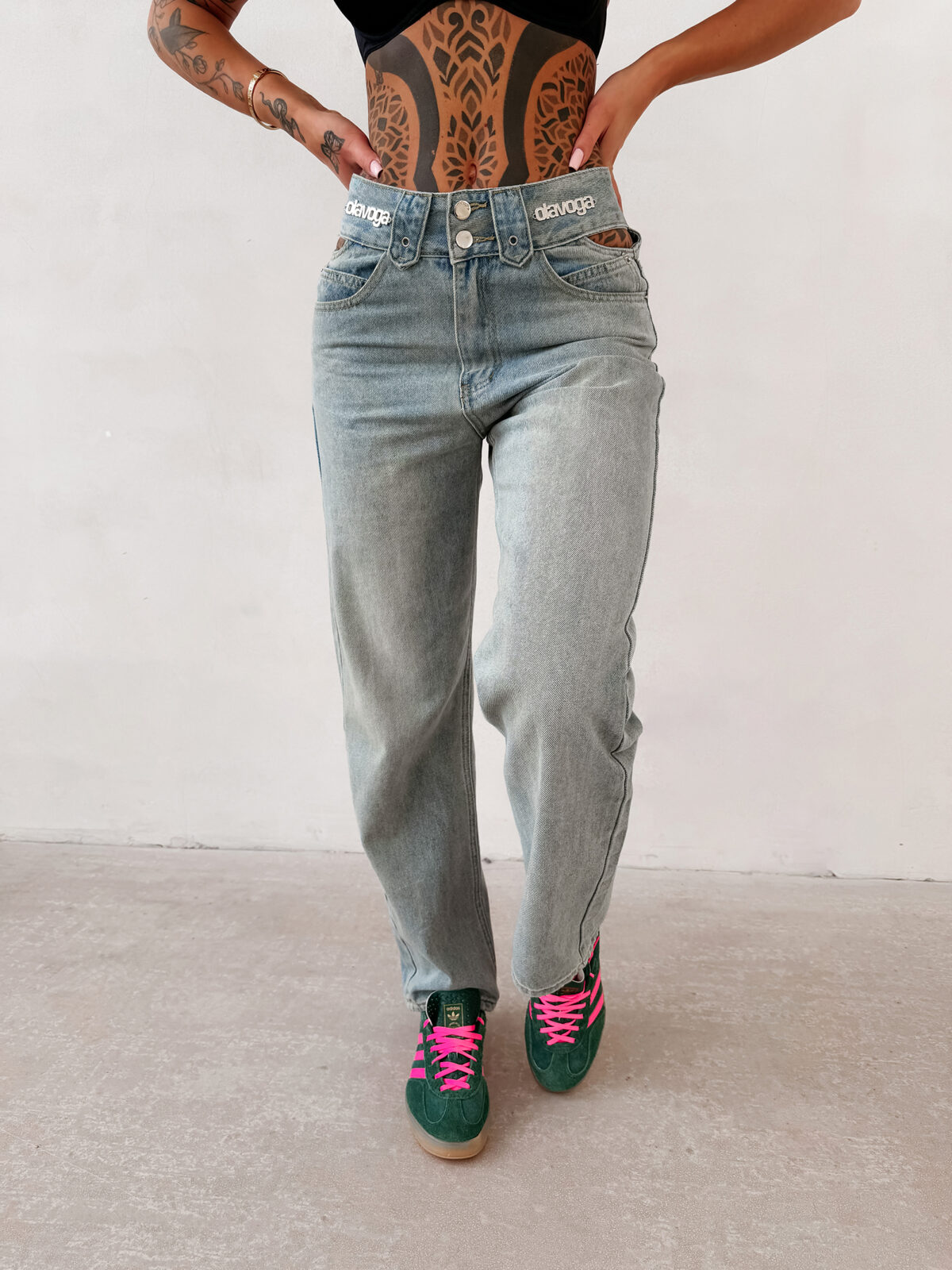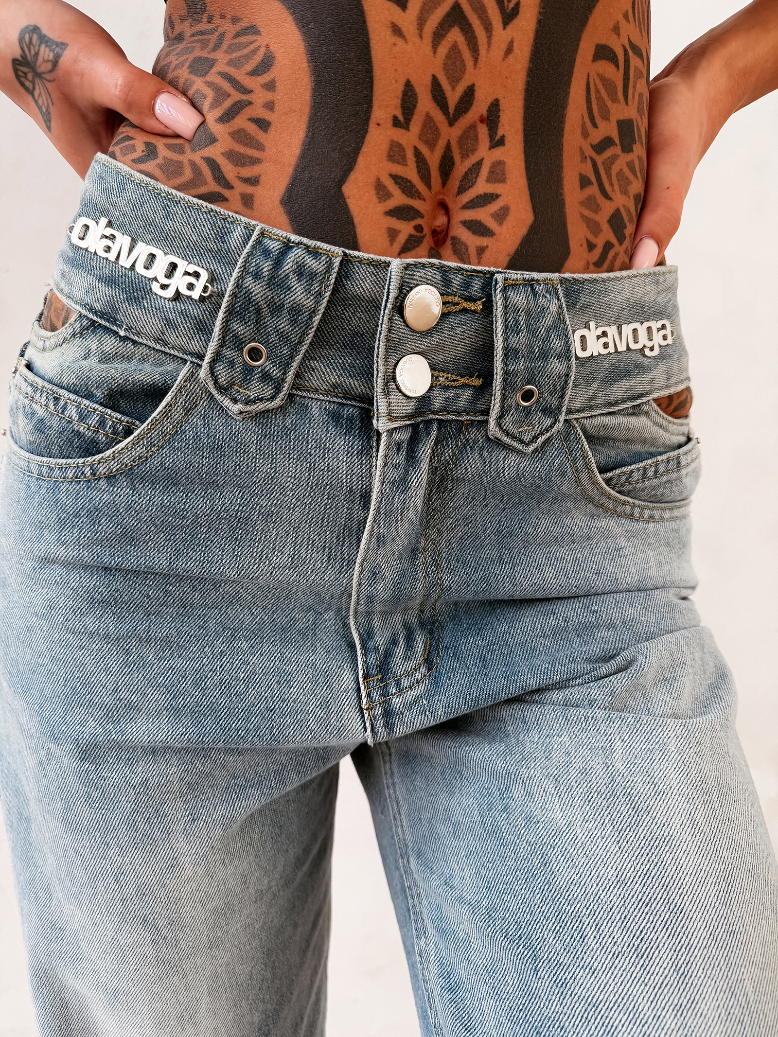 W pasie umieszczono delikatne detale z logo OLAVOGA, które dodają modelowi eleganckiego akcentu. Jest to subtelny element, który nie dominuje stylizacji, ale podkreśla jej charakter premium.