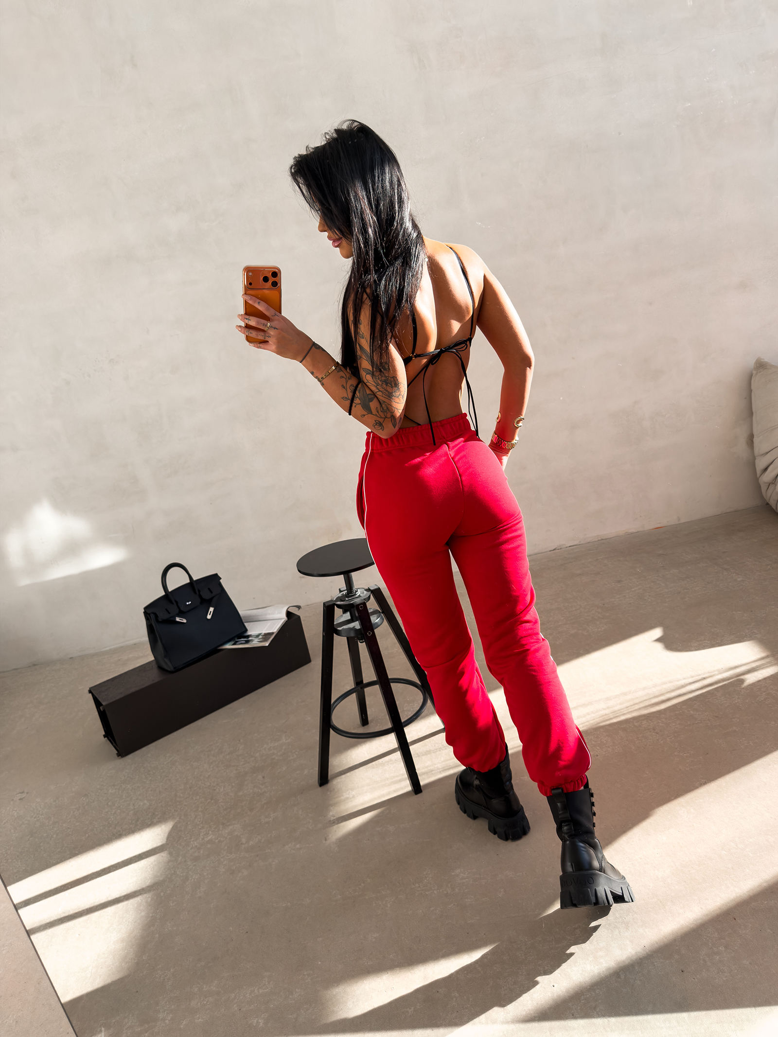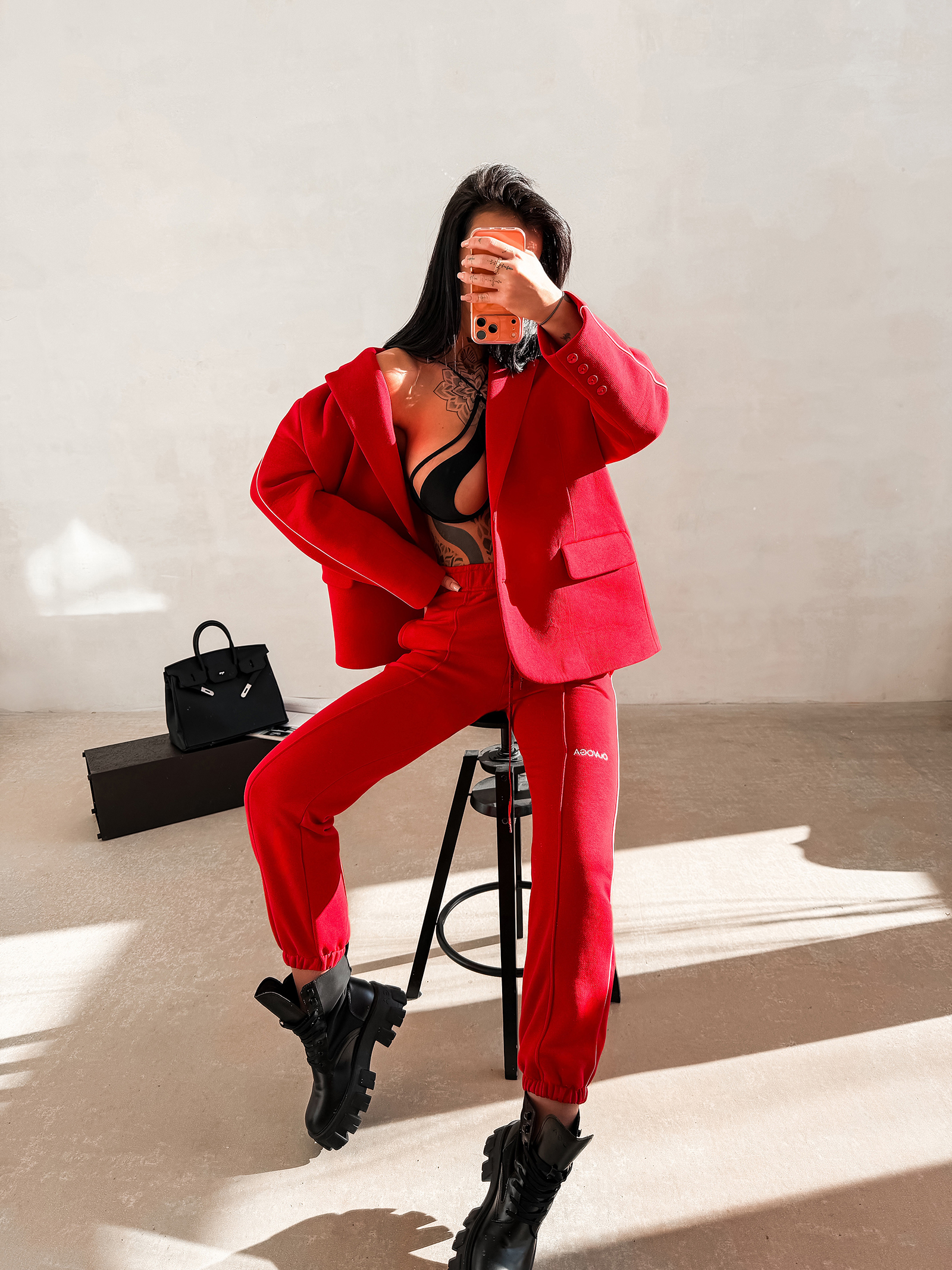 Elastyczny pas z regulacją umożliwia indywidualne dopasowanie, a wysoki stan zapewnia stabilność i wygodę podczas ruchu. Proste nogawki zakończone ściągaczami gwarantują swobodę oraz praktyczność w codziennym użytkowaniu. Lampasy pełnią funkcję wizualną, delikatnie wysmuklając nogi i nadając spodniom nowoczesnego charakteru.